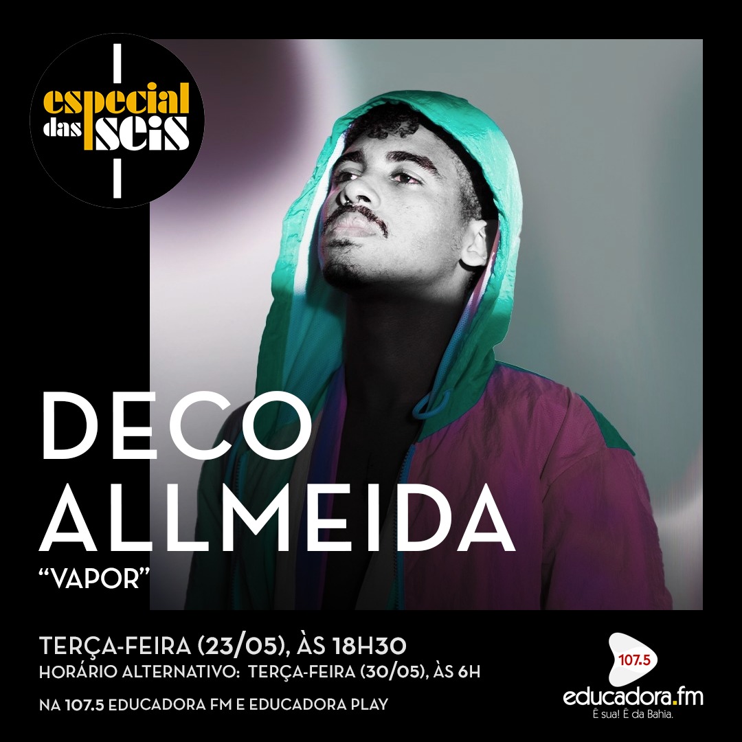 Nesta terça-feira (23), o Especial das Seis destaca “Vapor”, trabalho de estreia do cantor e compositor baiano Deco Allmeida, que apresenta o programa. Ele vai falar sobre o processo criativo desse EP autoral, que foi lançado em 2021 e traz as influências sonoras da infância e atuais, abordando assuntos que passam pelo amor romântico, o fazer artístico e as estações do ano. Nesta edição, você ouve a faixa-título “Vapor”, “Bebericando”, “Desejo”, entre outras canções.