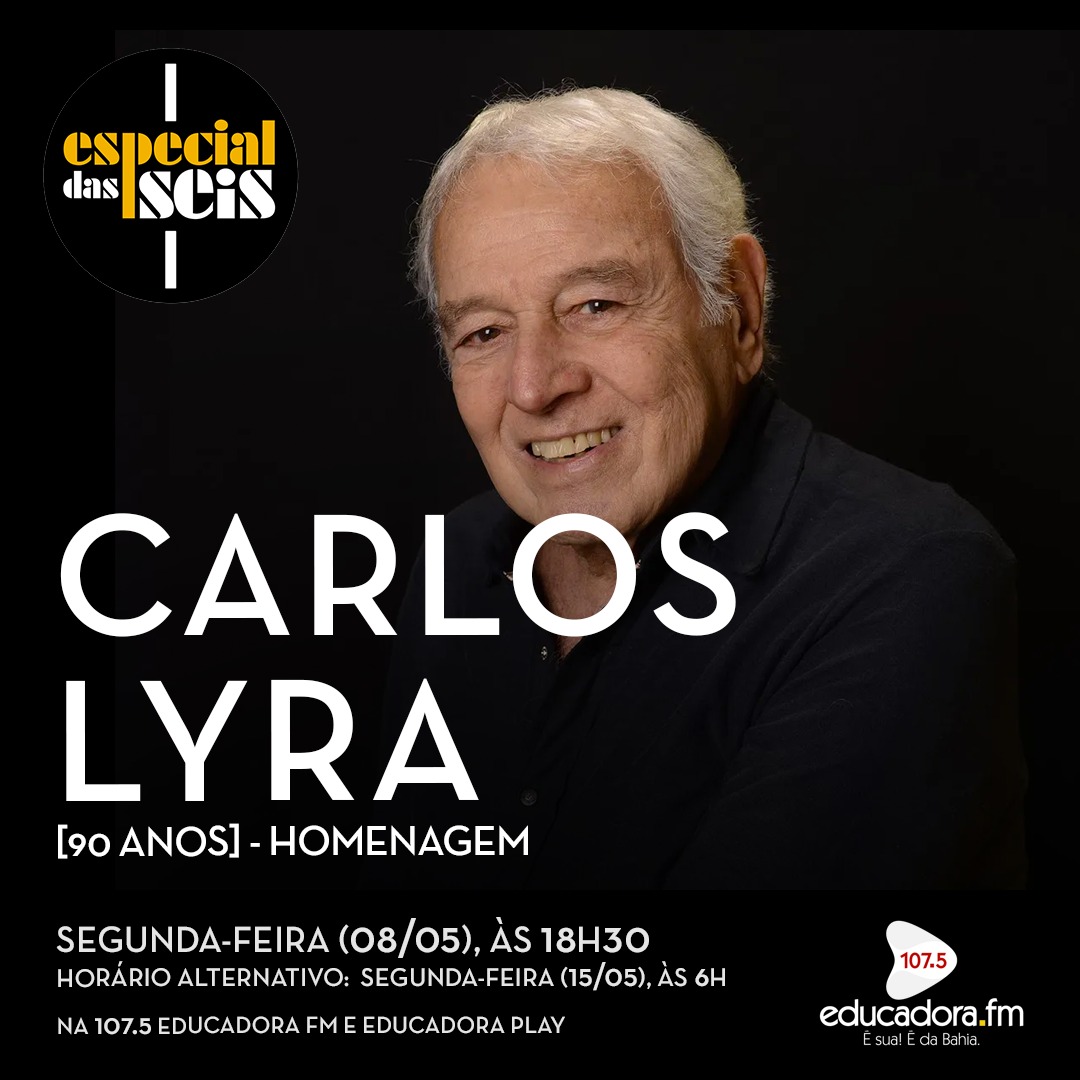 Nesta segunda-feira (08), o Especial das Seis homenageia um dos mais importantes e experientes artistas da MPB: o músico, cantor e compositor carioca Carlos Lyra, que está completando 90 anos de idade. Por ser um dos nomes mais gravados da nossa música, o programa traz uma seleção repleta de canções emblemáticas na interpretação do próprio Carlos Lyra e também de outros grandes artistas.