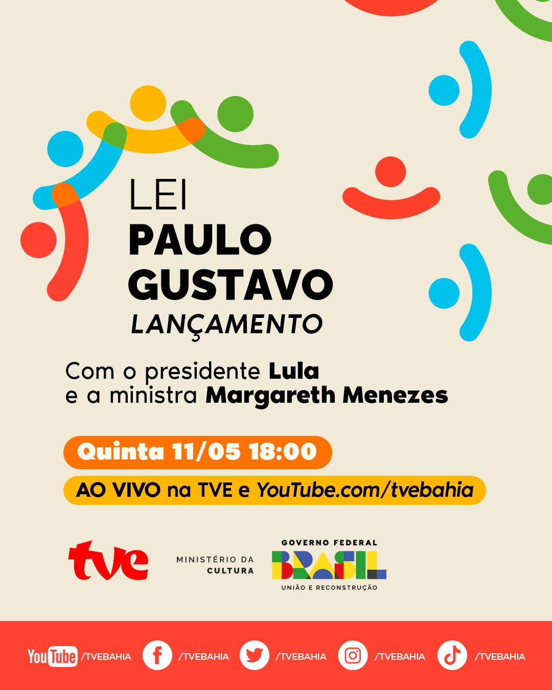 O lançamento da Lei Paulo Gustavo acontece nesta quinta-feira (11), às 18h, na Concha Acústica do Teatro Castro Alves, e será transmitido ao vivo pela TVE e no canal do YouTube da emissora. Com isso, os R$ 3,8 bilhões estarão disponíveis para municípios e estados realizarem projetos culturais. Os trabalhadores da cultura deverão acessar os recursos através de editais, chamamentos públicos, prêmios ou outras formas de seleção pública.