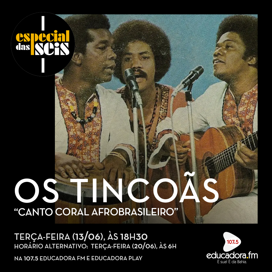 Nesta terça-feira (13), o Especial das Seis destaca “Canto Coral Afrobrasileiro”, álbum do icônico grupo baiano Os Tincoãs, formado pelos cachoeiranos Mateus Aleluia, Dadinho e Badu. O programa tem a apresentação da pesquisadora, cineasta e escritora Tenille Bezerra, diretora artística desse trabalho, que foi gravado em 1983 e lançado somente em abril de 2023, 40 anos depois. Considerado um marco da expressão cultural afro-brasileira, o disco possui um repertório com 10 faixas, entre canções inéditas e releituras de alguns sucessos do grupo, contando ainda com a participação do coral da Empresa Brasileira de Correios e Telégrafos. A produção é de Adelzon Alves e os arranjos têm a assinatura do maestro Leonardo Bruno. Nesta edição, você vai ouvir “Pelebé Nitobé”, “Cequecê”, “Obaluaê”, entre outras músicas.
