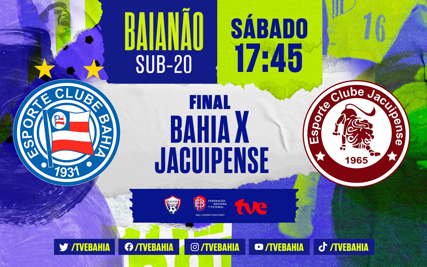 Neste sábado (17), a TVE Bahia transmite a partida entre Bahia x Jacuipense, a partir das 17h45, acompanhando o pré-jogo da decisão. Com narração de Valter Lima e comentários de Rodrigo Araújo, o jogo que definirá o ganhador do título do Baianão sub-20 acontece no estádio Pituaçu em Salvador.