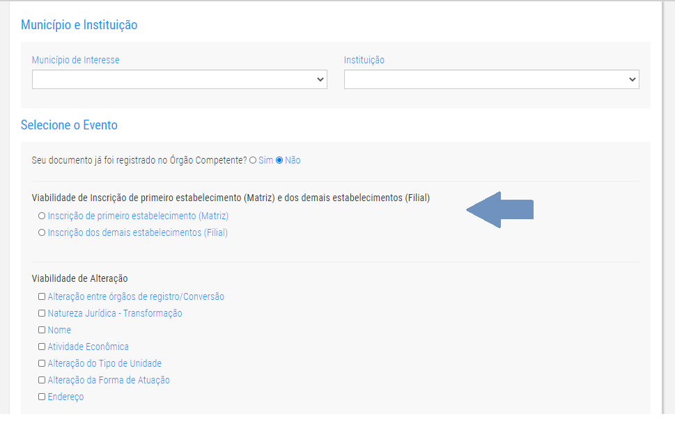 Com a página aberta, selecione o Município de interesse e o órgão de Registro; após, selecione a opção “Inscrição de primeiro estabelecimento (Matriz)”.