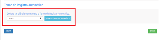 1. Viabilidade para Registro Automático: caso opte pela constituição da empresa via registro automático, deverá selecionar a opção “Aceito”, conforme tela abaixo, antes de enviar o pedido. Para maiores informações sobre o procedimento, acesse o link Registro Automático.