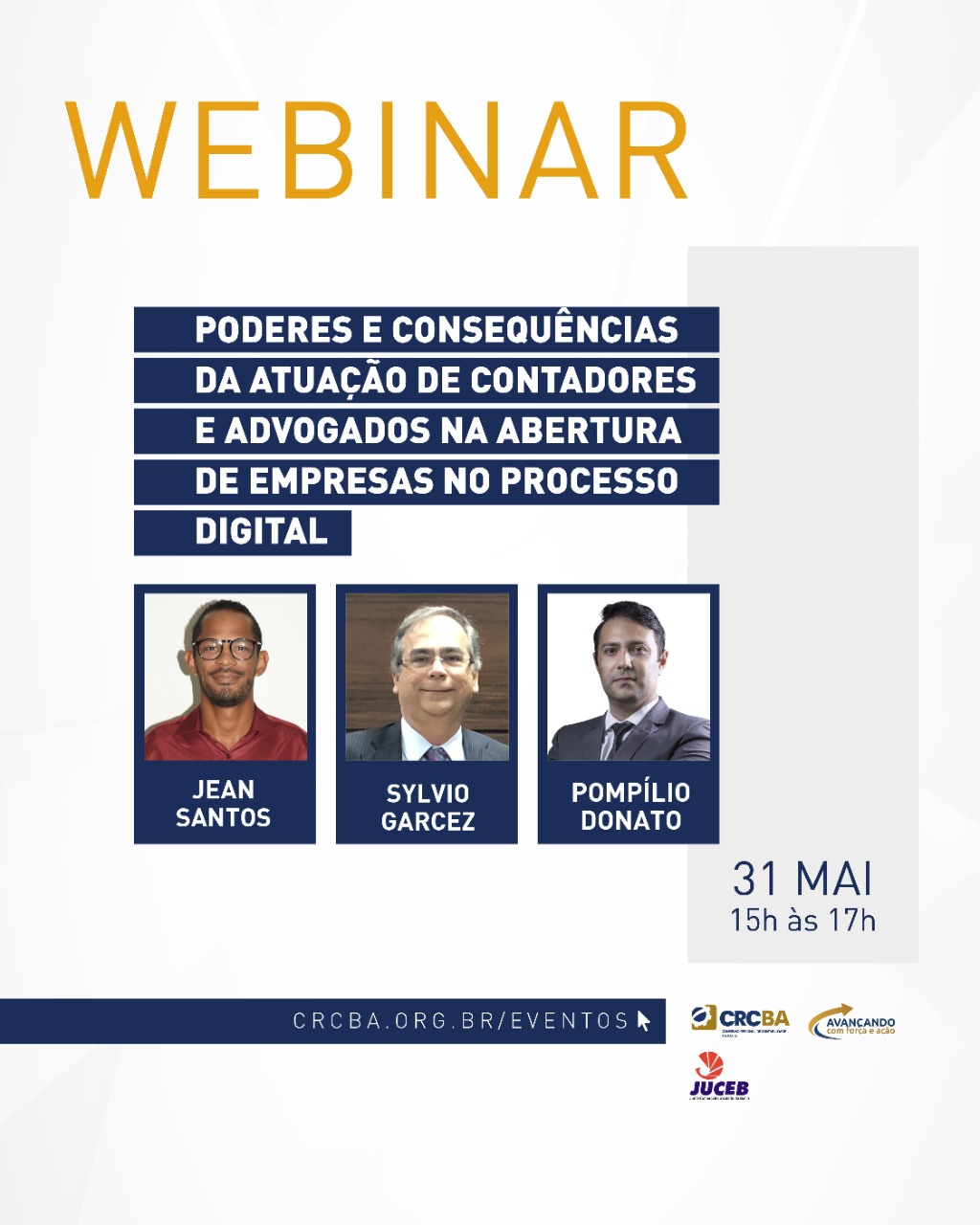 CRCBA e Juceb  realizarão o Webinar Poderes e consequências da atuação de Contadores e Advogados na abertura de Empresas no Processo Digital com o objetivo de ressaltar a importância desses profissionais na orientação aos seus clientes.