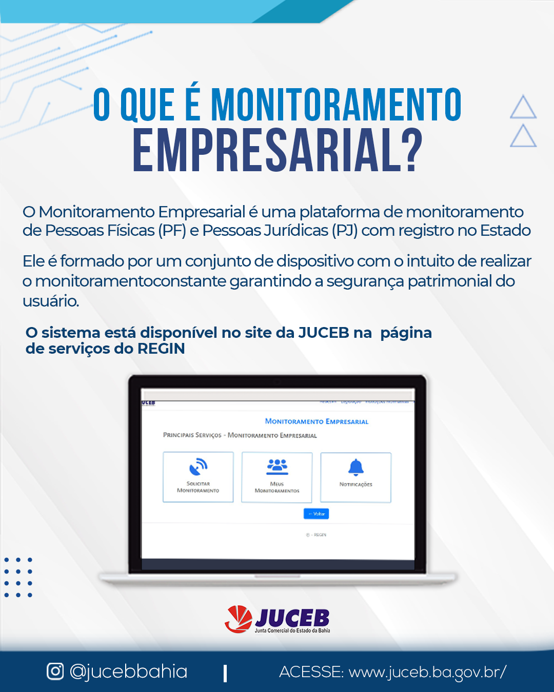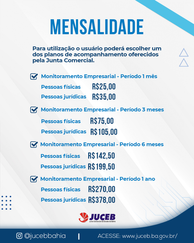 Agora a Junta Comercial da Bahia possui o serviço de Monitoramento Empresarial, consiste em uma plataforma de monitoramento de Pessoas Físicas (PF) e Pessoas Jurídicas (PJ) com registro do Estado.