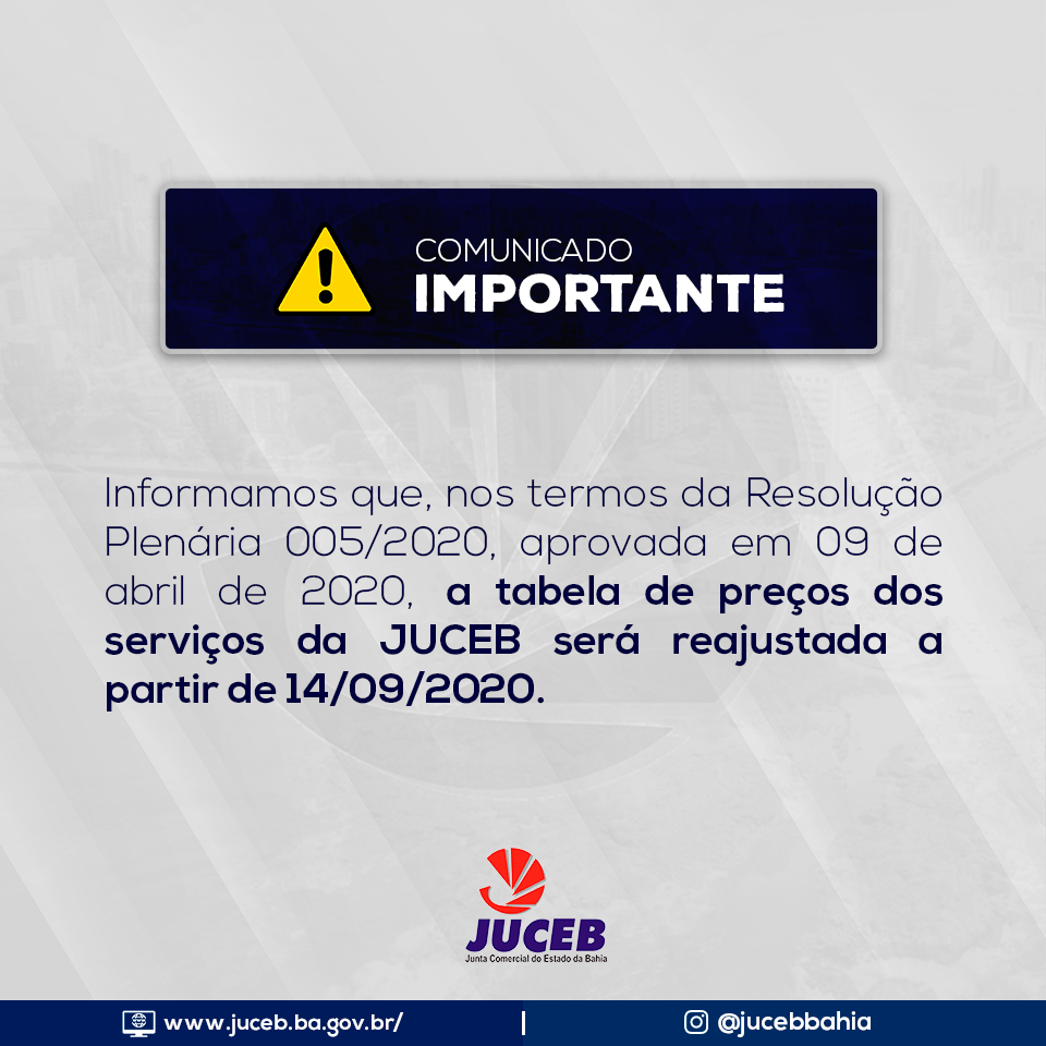 Considerando o início da retomada da economia e os impactos negativos na situação fiscal da autarquia, que está a 18 (dezoito) meses sem atualização dos seus preços, a Juceb, na reunião plenária ocorrida em 08/09/20, com a presença de seu corpo de vogais, que representam entidades de classe como CRC/BA, CORECON/BA, OAB/BA, FIEB, Fecomercio, Associação Comercial, etc., decidiu, por unanimidade, retirar a suspensão dos efeitos da Resolução 005/2020 e aplicar o reajuste de 6,82% na sua tabela a partir de 14/09/2020, percentual este referente ao IGPM medido no acumulado de 12 meses (março/19 à fevereiro/20), que utilizou como referência a data de aprovação da resolução retro.