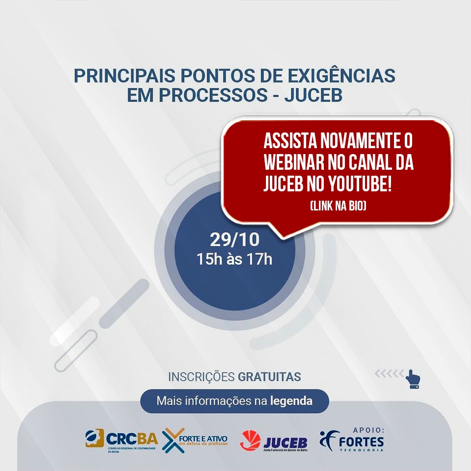 Se inscreva no nosso canal do YouTube e assista novamente o 2• Webinar - Principais pontos de exigências em Processos da Juceb, e a todos os Webinários Juceb 100% Digital.
