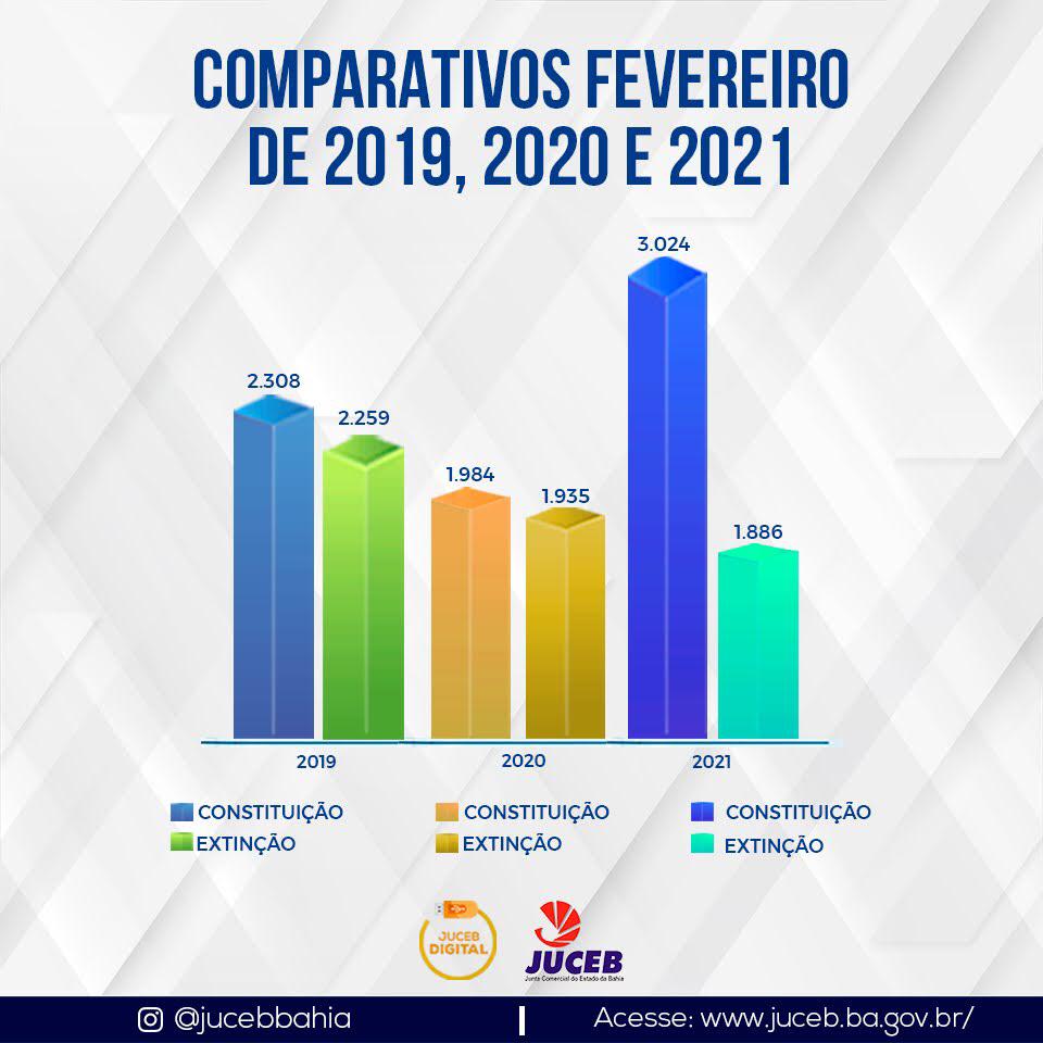 O segundo gráfico aponta a evolução no número de constituição de empresas, e a queda no número de empresas extintas na Bahia no mês de fevereiro, comparado aos últimos 2 anos.