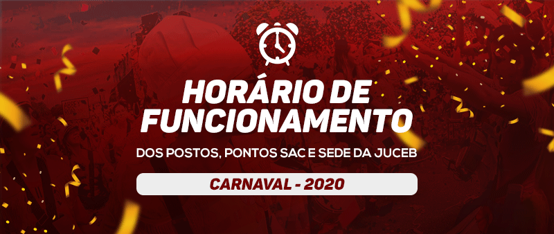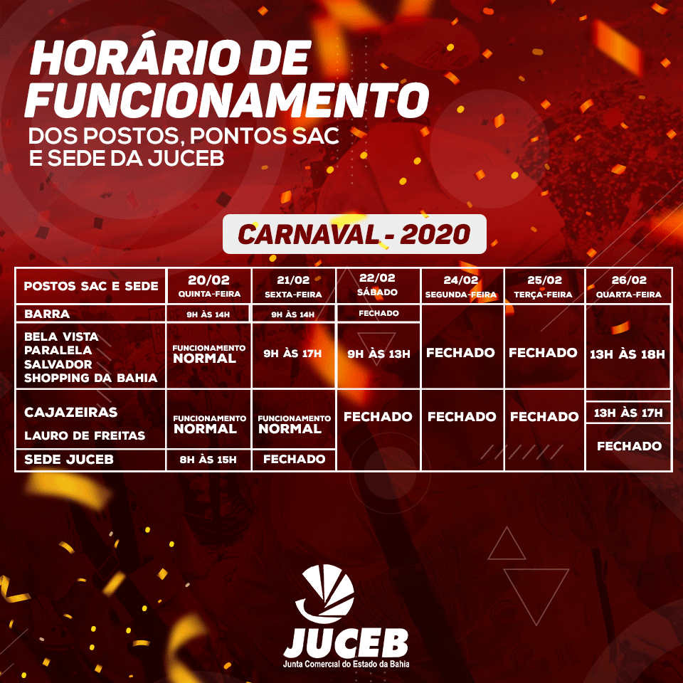 Em decorrência do recesso de Carnaval, segue a programação de funcionamento da Junta Comercial do Estado da Bahia e seus postos nos SACs. Confira abaixo os horários de funcionamento: