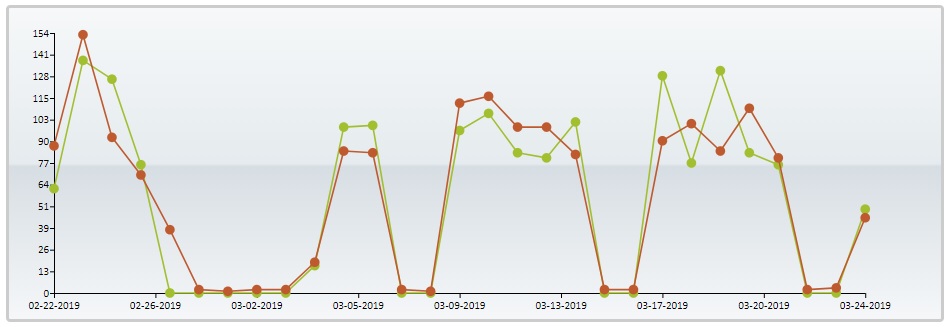 Números do primeiro mês da ferramenta. Em vermelho a quantidade de solicitações e em verde a quantidade de respostas[/caption]