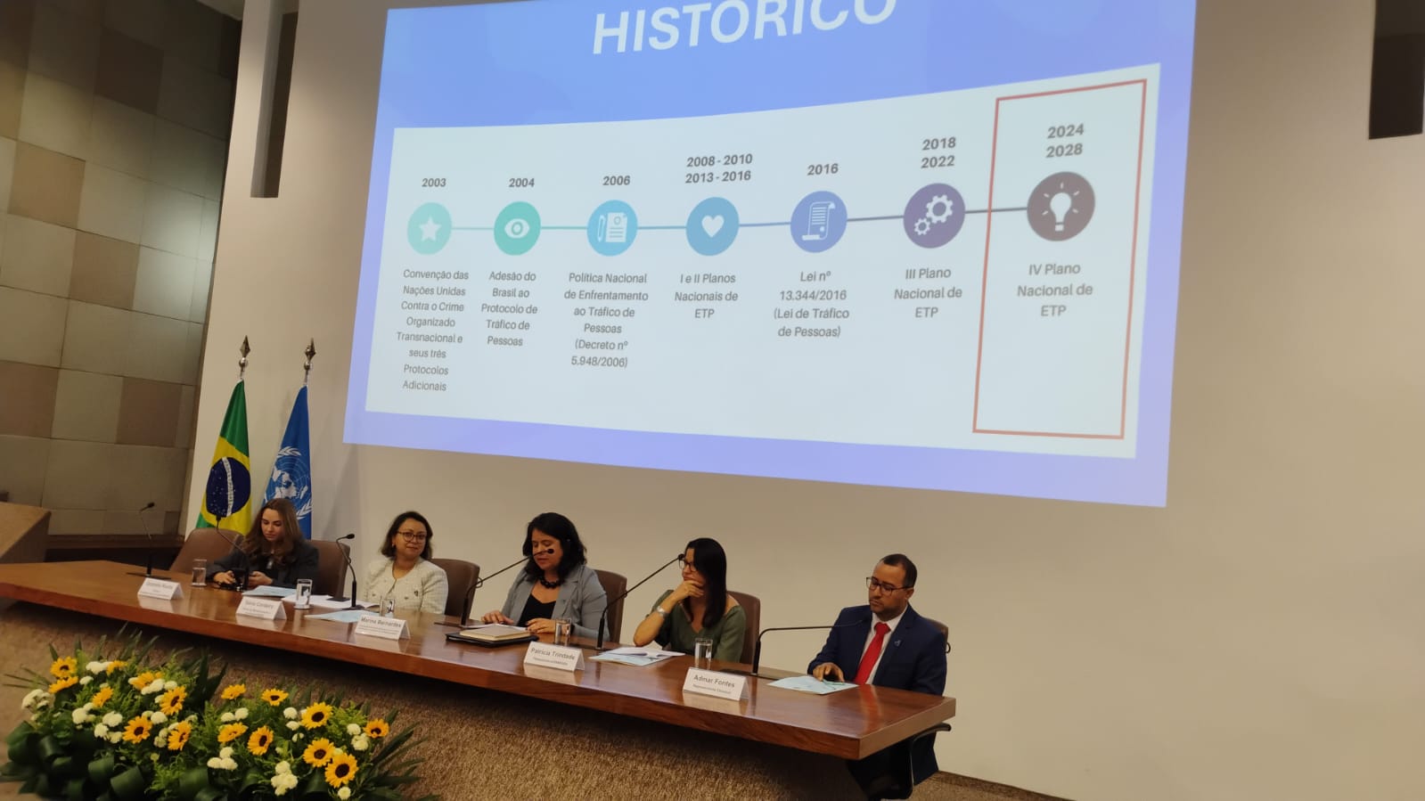 Plano Nacional- Além da mobilização, a SJDH participou hoje, em Brasília/DF, do Seminário Nacional ‘Um Novo Capítulo da Política Nacional de Enfrentamento ao Tráfico de Pessoas’, que marca o lançamento do ‘IV Plano Nacional de Enfrentamento ao Tráfico de Pessoas’. O instrumento visa nortear as ações do Estado Brasileiro para combater a prática e terá vigência de quatro anos (2024 - 2028). Com participação da Organização das Nações Unidas (ONU) e da sociedade civil, o documento apresenta cinco eixos estratégicos (estruturação da política pública, coordenação e parcerias, prevenção, proteção e assistência às vítimas, repressão e responsabilização) para aperfeiçoar a atuação dos órgãos envolvidos para o enfrentamento ao Tráfico de Pessoas.