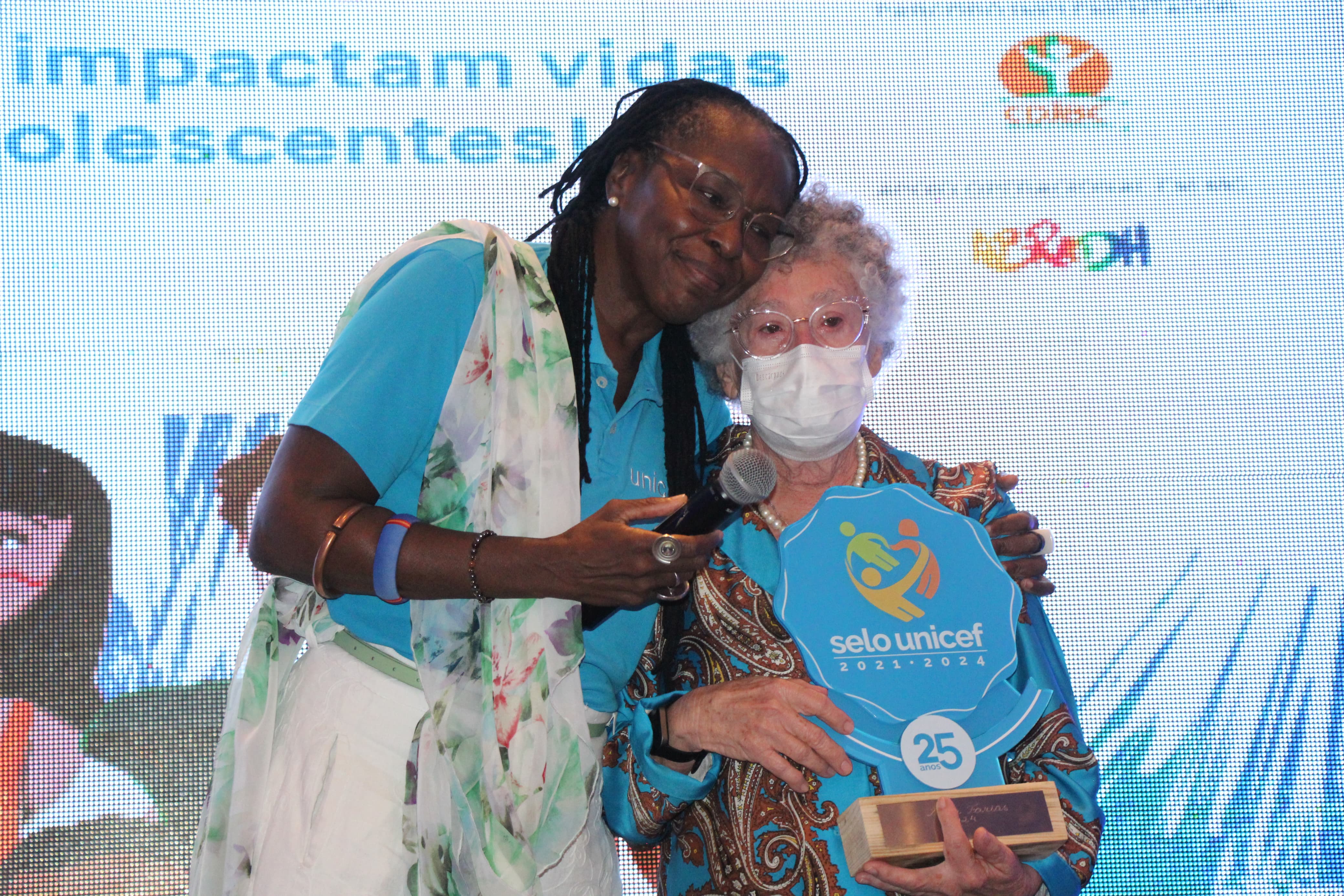 Emocionada, Farias recebeu o Selo das mãos da chefe do escritório da Unicef em Salvador, Helena Oliveira. "Aqui na Bahia, tenham Iara como referência, porque lutar por crianças e adolescentes como ela luta, aos seus 80 anos de vida, é algo que a gente tem que registrar e respeitar, além de termos como exemplo", afirmou Oliveira. Em curtas, mas tocantes palavras, dona Iara agradeceu singelamente a homenagem. Na plateia, o jovem Fagner, que fora alcançado, na adolescência, por projetos desenvolvidos pela gestora, a parabenizou, subiu ao palco e abraçou-a.