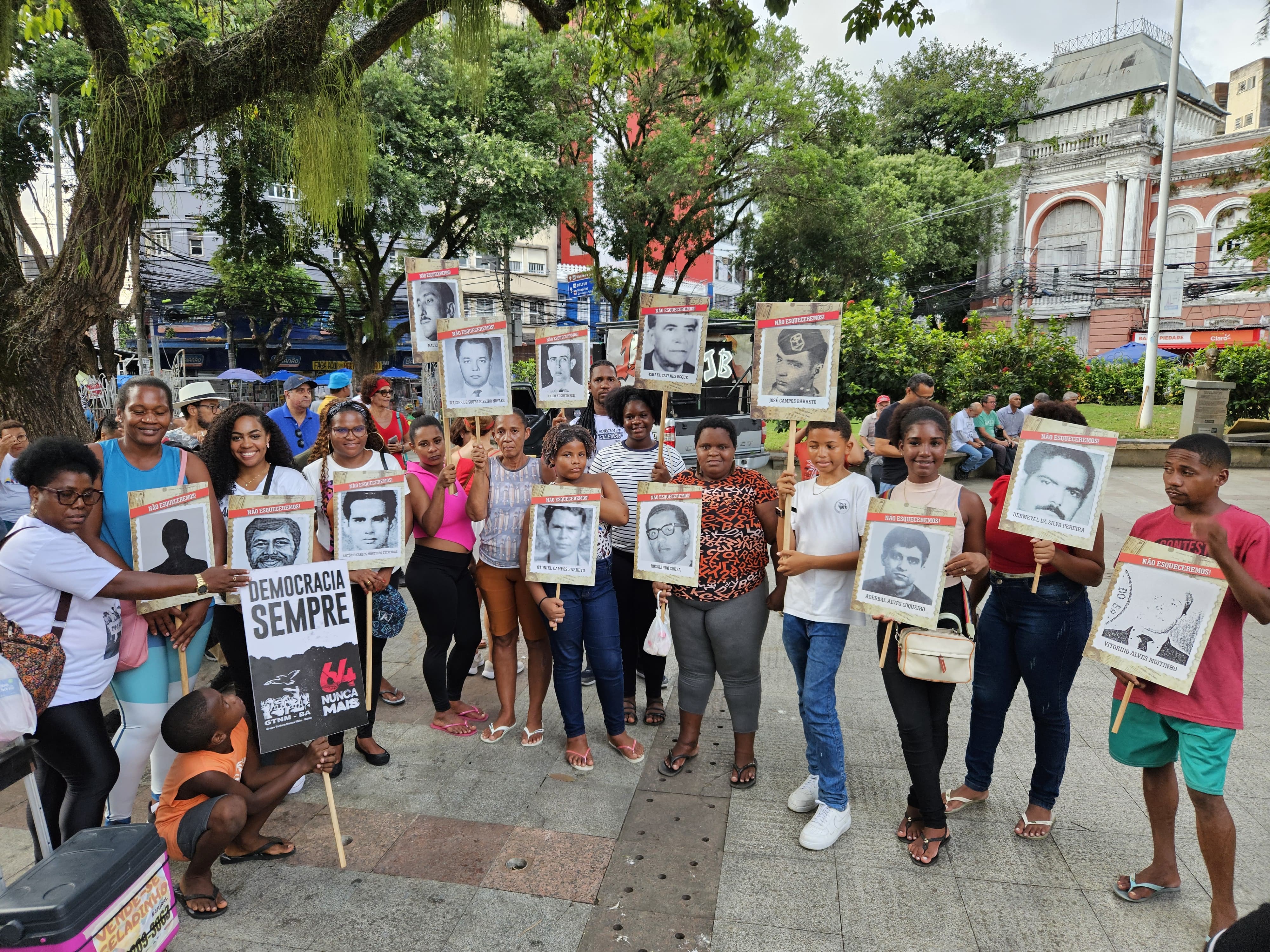 Militantes, ativistas dos direitos humanos, centrais sindicais, professores, estudantes e representantes dos poderes Executivo e do Legislativo marcharam da Praça da Piedade até o Campo da Pólvora, segurando flores e tochas em um gesto de respeito à memória dos mortos e desaparecidos políticos. Na chegada, foram fixadas cruzes de madeira em frente ao monumento que homenageia as vítimas da ditadura militar, marcando o dia de luta e de protesto. De autoria do artista plástico Ray Viana, a obra inaugurada pelo Governo do Estado em 2015, tem quatro metros e traz o nome de 35 baianos desaparecidos e mortos na luta pela liberdade. O momento contou com o acalento do Coro Juvenil do Neojiba, sob a regência do maestro Joilson Cerqueira.