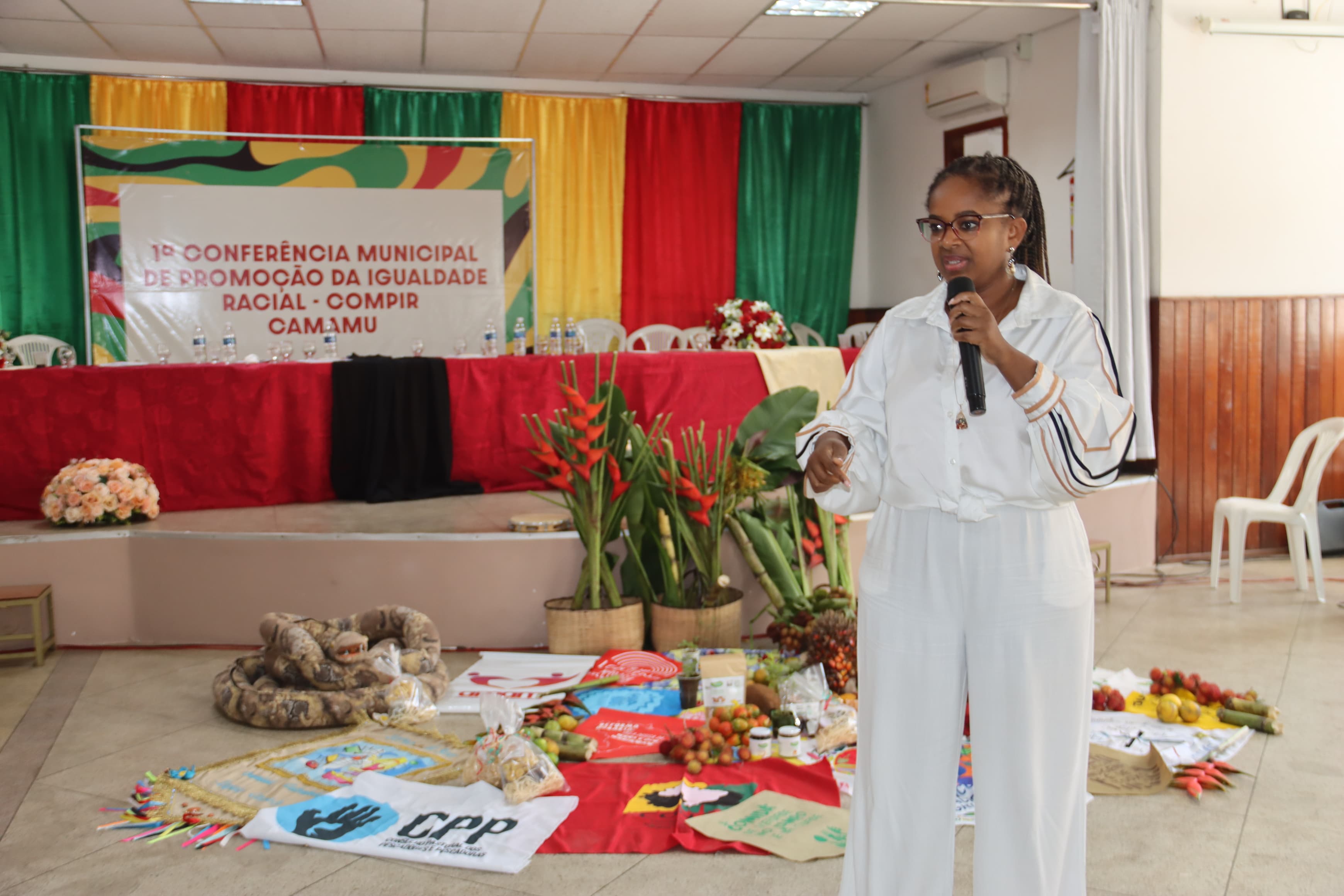 A I Conferência de Promoção da Igualdade Racial de Camamu contou com a participação da superintendente de Apoio e Defesa aos Direitos Humanos da SJDH, Trícia Calmon, compondo a mesa de abertura e com atividades voltadas para a juventude, construídas a partir da Caravana.