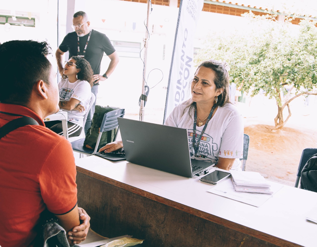 A quilombola e agricultora Edileuza Jesus, da comunidade Terra da Lua, aproveitou a oportunidade de encontrar os serviços reunidos para resolver pendências próprias e da família. “Hoje, estou aqui na Caravana procurando os direitos da gente. Tem muita coisa importante: identidade, aposentadoria, BPC, orientação… Quero sair daqui com minha vida toda resolvida”. Dona Edileuza levou os netos e filhos para fazer a Carteira de Identidade Nacional e aproveitou para tirar dúvidas sobre a Previdência Social e obter informações sobre o Passe Livre Digital para Pessoas com Deficiência.