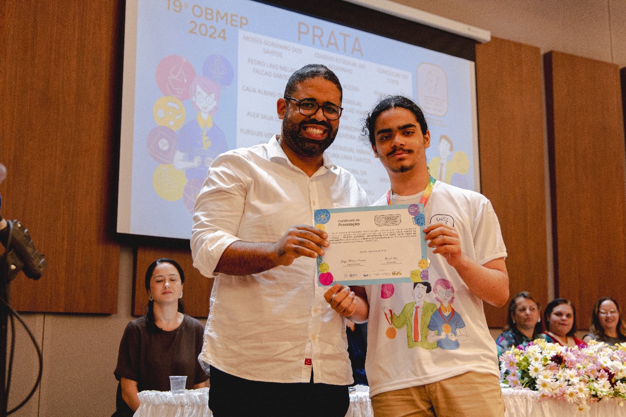 Jovens que cumprem medida socioeducativa na Fundação da Criança e do Adolescente (Fundac), autarquia da Secretaria de Justiça e Direitos Humanos (SJDH), foram contemplados com medalha de bronze e menção honrosa na 19ª edição da Olimpíada Brasileira de Matemática das Escolas Públicas 2024 (OBMEP 2024). Os adolescentes J. G. de S. e E. J. de A. S. receberam os títulos nesta quarta-feira (6), durante a solenidade de Premiação Estadual do concurso. Com essas conquistas, os jovens mostram, mais uma vez, que o conhecimento permite traçar novos caminhos, renovar esperanças e transformar realidades.