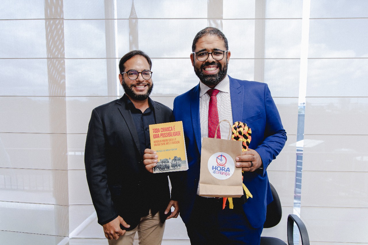 O secretário de Justiça e Direitos Humanos da Bahia, Felipe Freitas, recebeu nesta terça-feira (9), o presidente da organização da sociedade civil ‘Hora da Criança’, Mateus Russo, acompanhado do conselheiro da entidade, Guilherme Hunder. A visita à sede do órgão, em Salvador, teve como objetivo a apresentação de propostas de parcerias para a promoção de projetos de arte-educação e cidadania, focados em jovens em situação de vulnerabilidade.