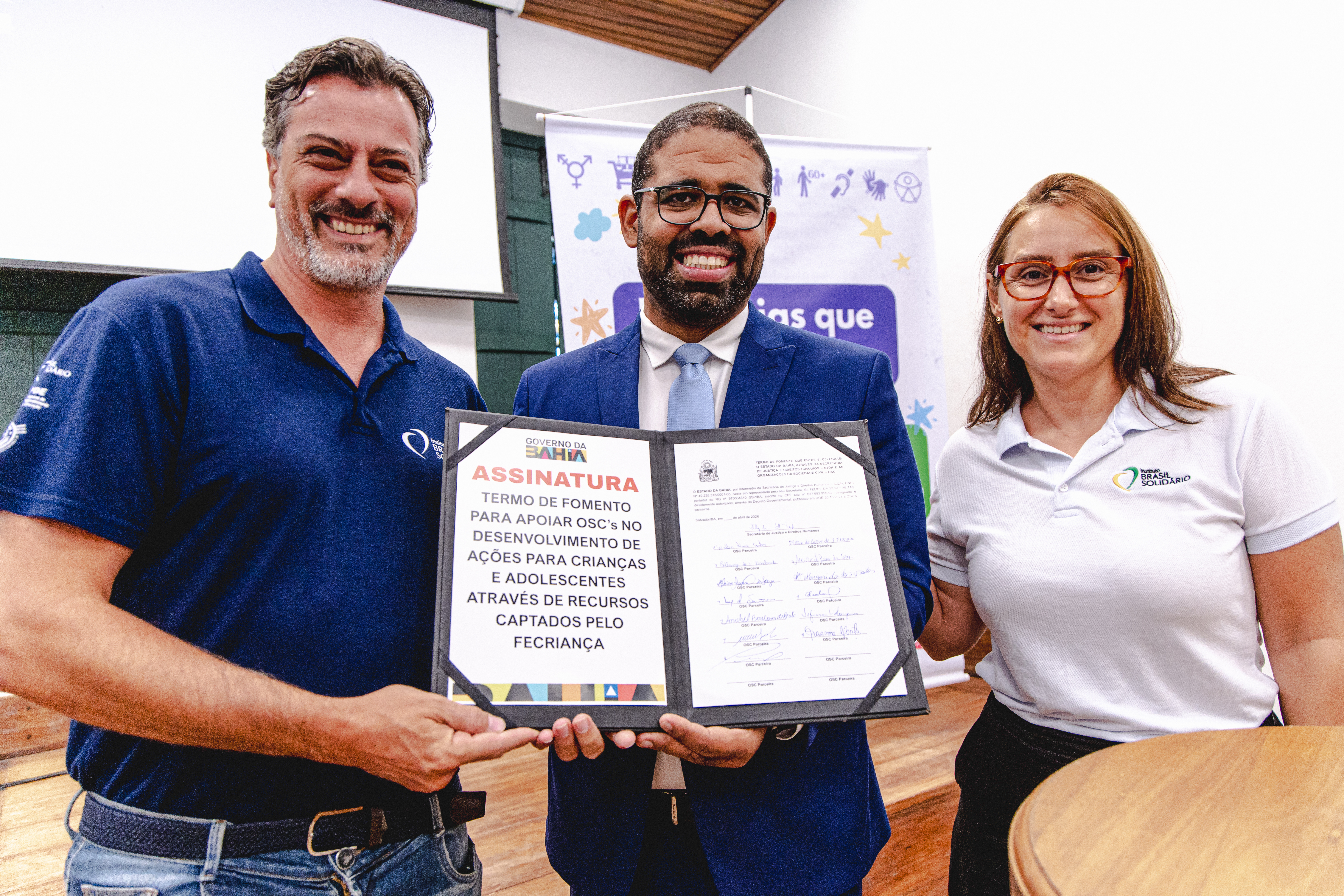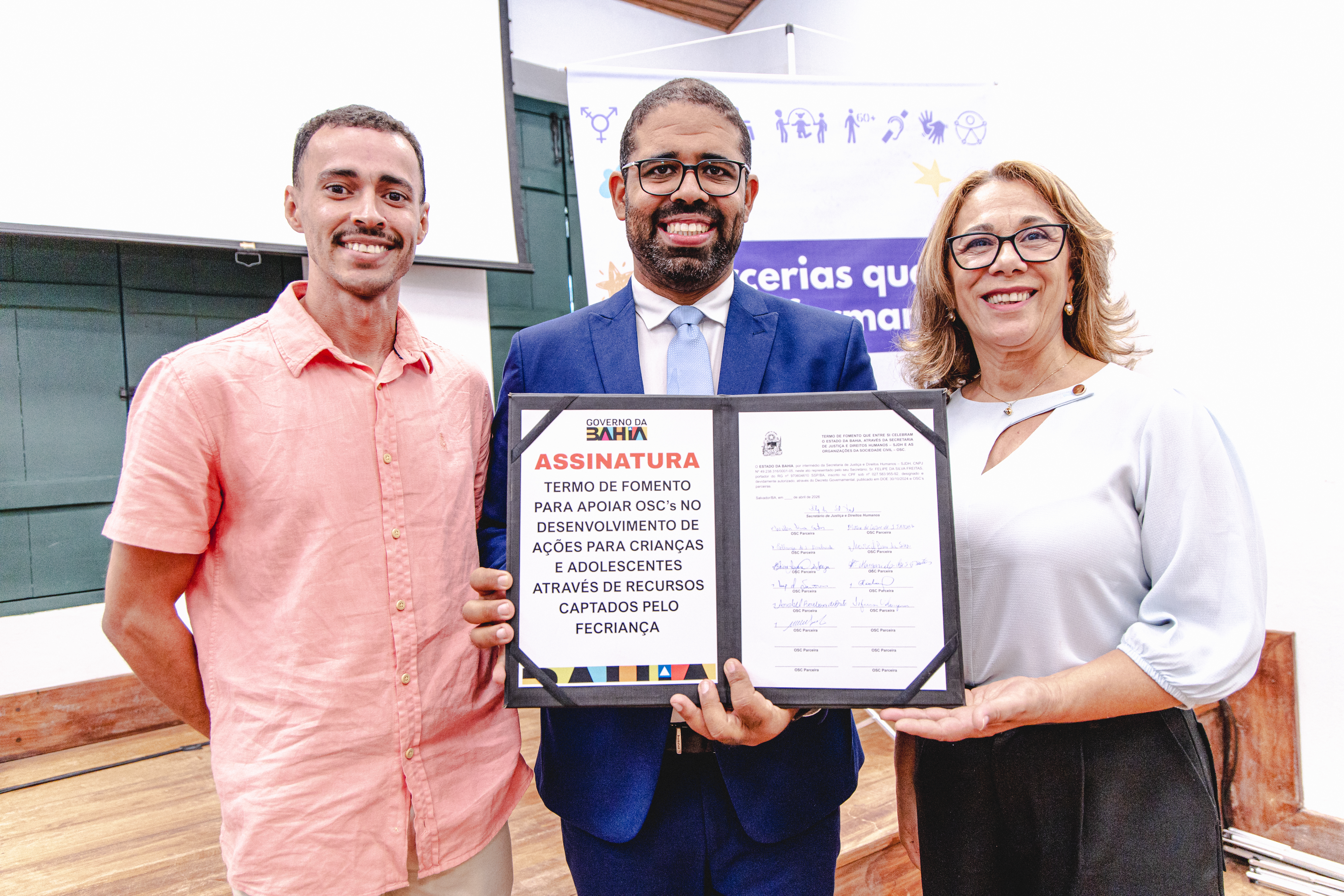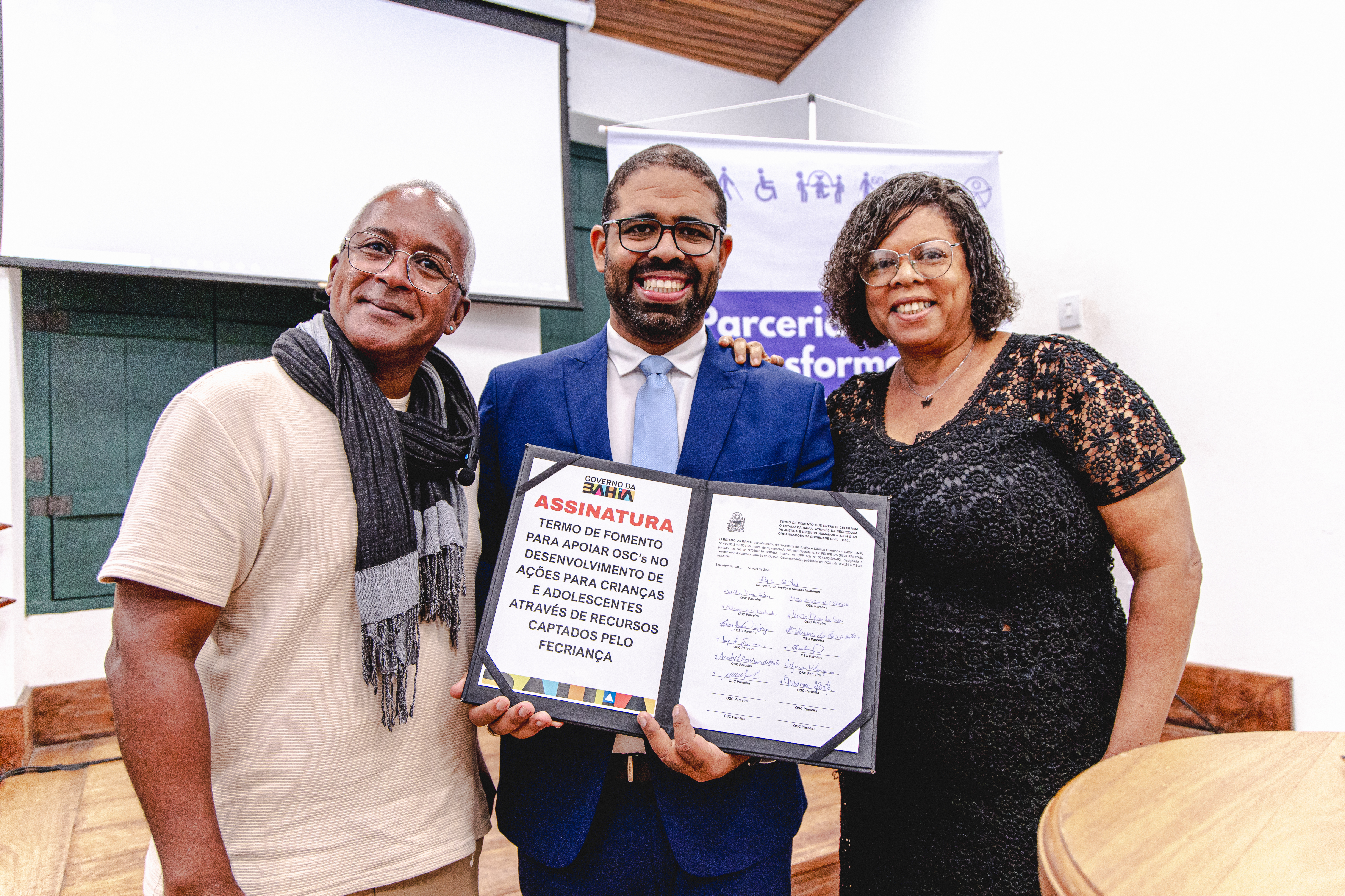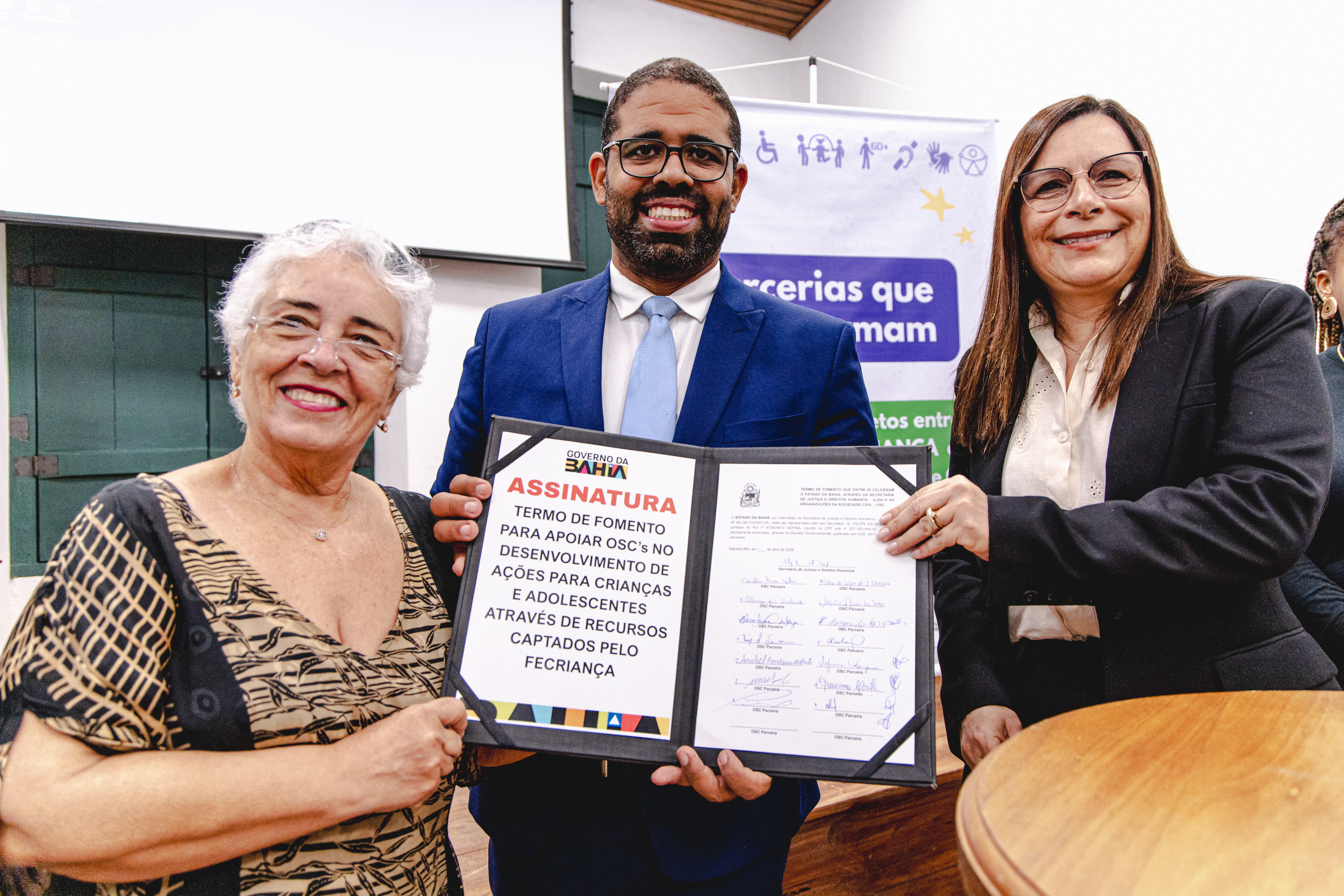 A Secretaria de Justiça e Direitos Humanos (SJDH) realizou, nesta terça-feira (7), a assinatura de 16 projetos com organizações da sociedade civil, durante ato na Biblioteca Anísio Teixeira, em Salvador. A iniciativa, conduzida em parceria com o Conselho Estadual dos Direitos da Criança e do Adolescente (CECA) e com recursos do Fundo Estadual da Criança e do Adolescente (Fecriança), marca também o início de uma oficina de capacitação sobre o Marco Regulatório das Organizações da Sociedade Civil (MROSC).