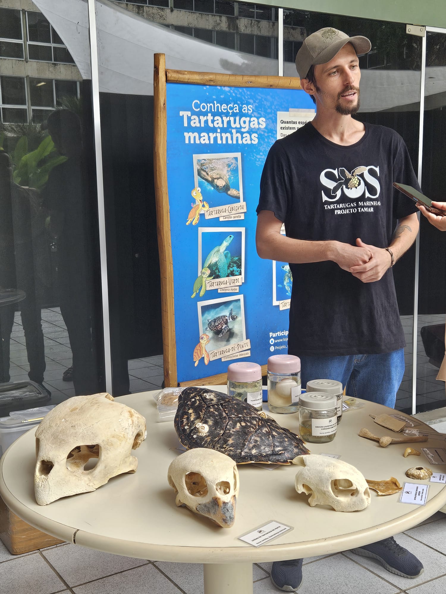 Representando o Projeto Tamar, o Engenheiro Ambiental, Landis Petersen, explicou a importância da exposição das Tartarugas Marinhas na semana do Meio Ambiente. “Estamos no mês de junho, que é muito importante pra gente, além de hoje ser o dia do Meio Ambiente, porém dia 08 é dia do Oceano e dia 16 é o dia da Tartaruga Marinha. É importante estarmos aqui para poder levar essa mensagem de conservação, explicar sobre esses animais que estão tão presentes no nosso litoral. Está na biblioteca, que é um ambiente de cultura e conhecimento, é essencial trazer essa mensagem, porque a conservação não se faz sozinha”, disse Landis.