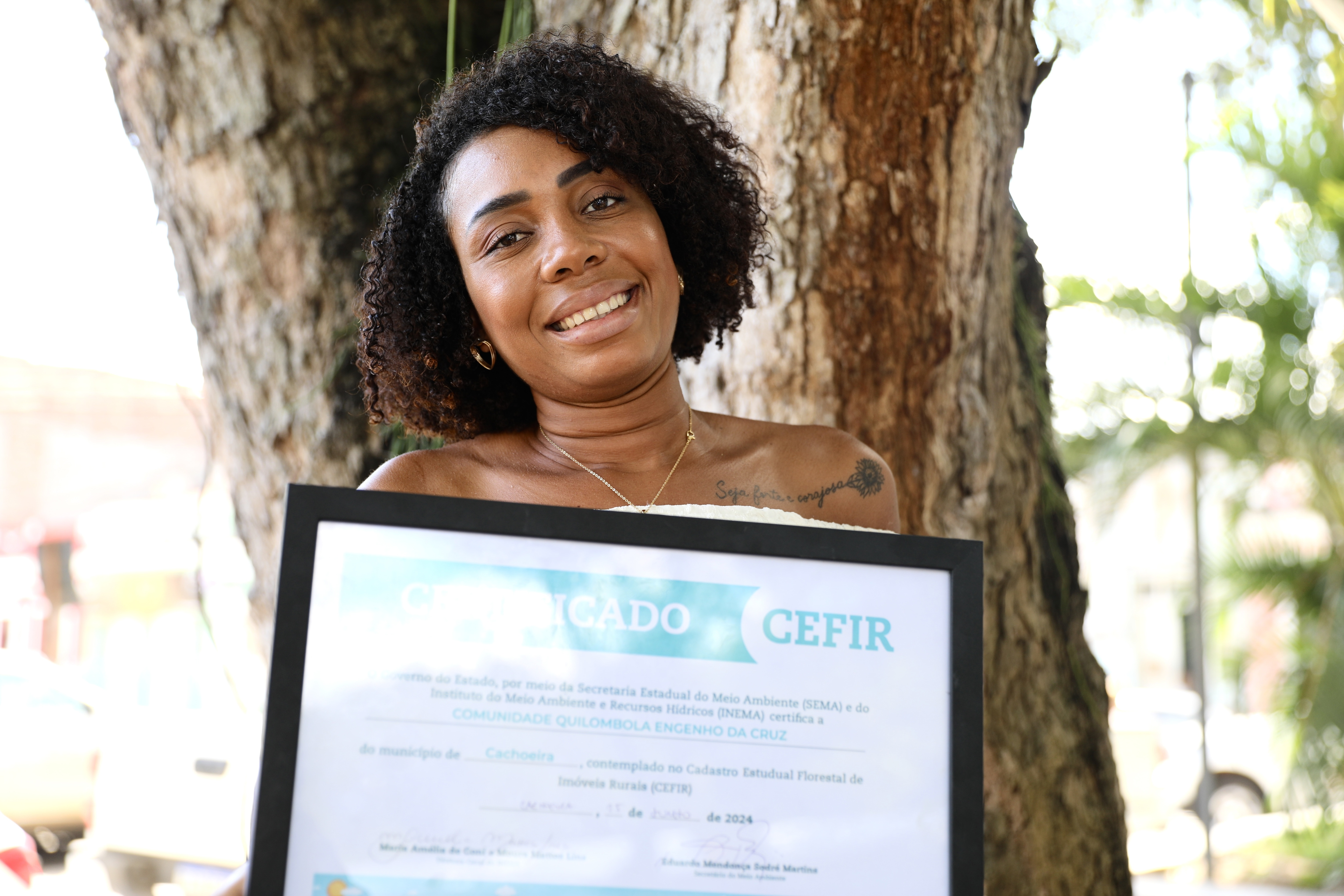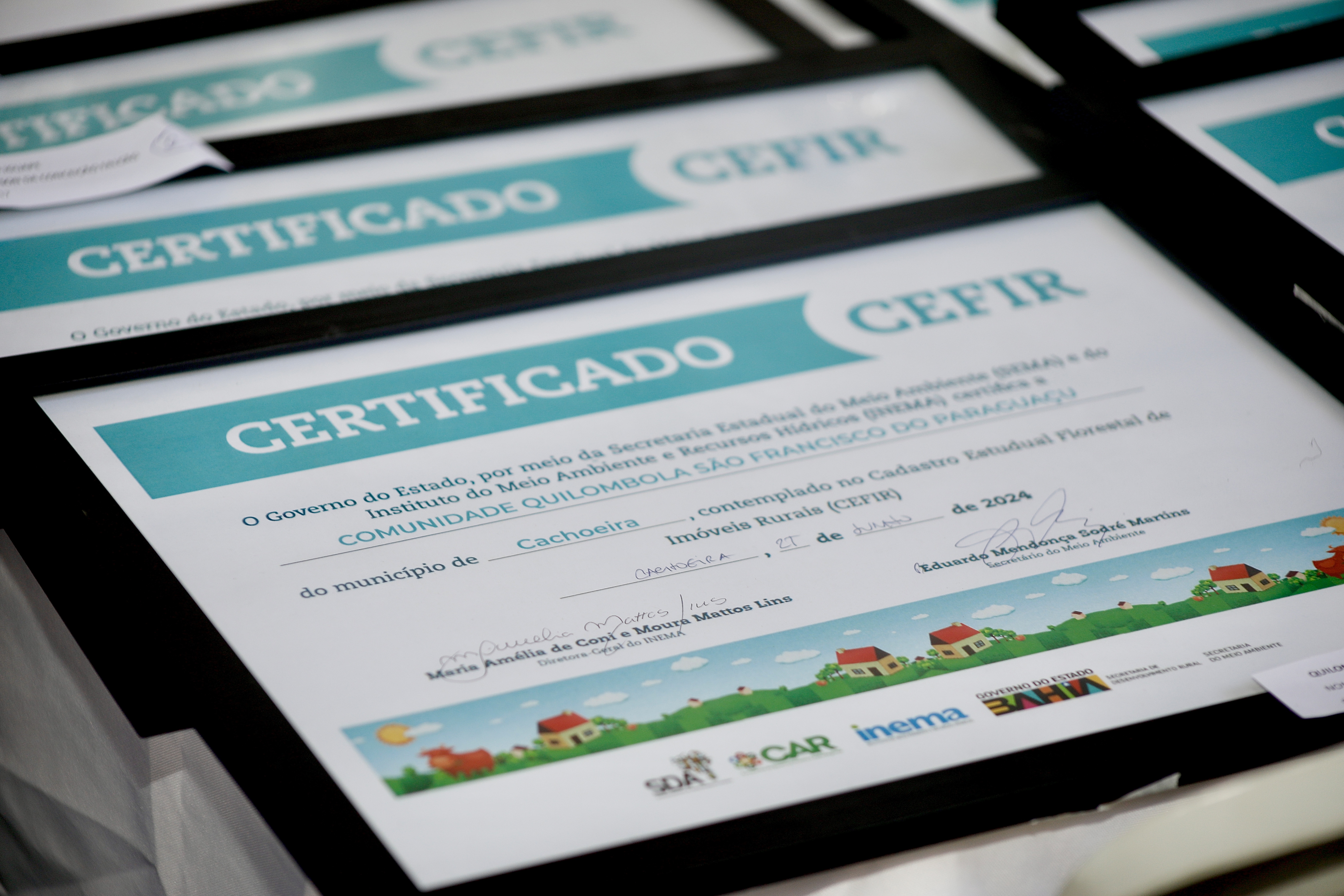 No mesmo dia, o chefe de gabinete da Secretaria do Meio Ambiente (Sema), André Ferraro, representando o secretário Eduardo Mendonça Sodré Martins, e a diretora-geral do Inema, Maria Amélia Lins, acompanharam Tatiana Velloso, primeira-dama da Bahia, na entrega dos certificados do Cefir às comunidades quilombolas de Cachoeira.