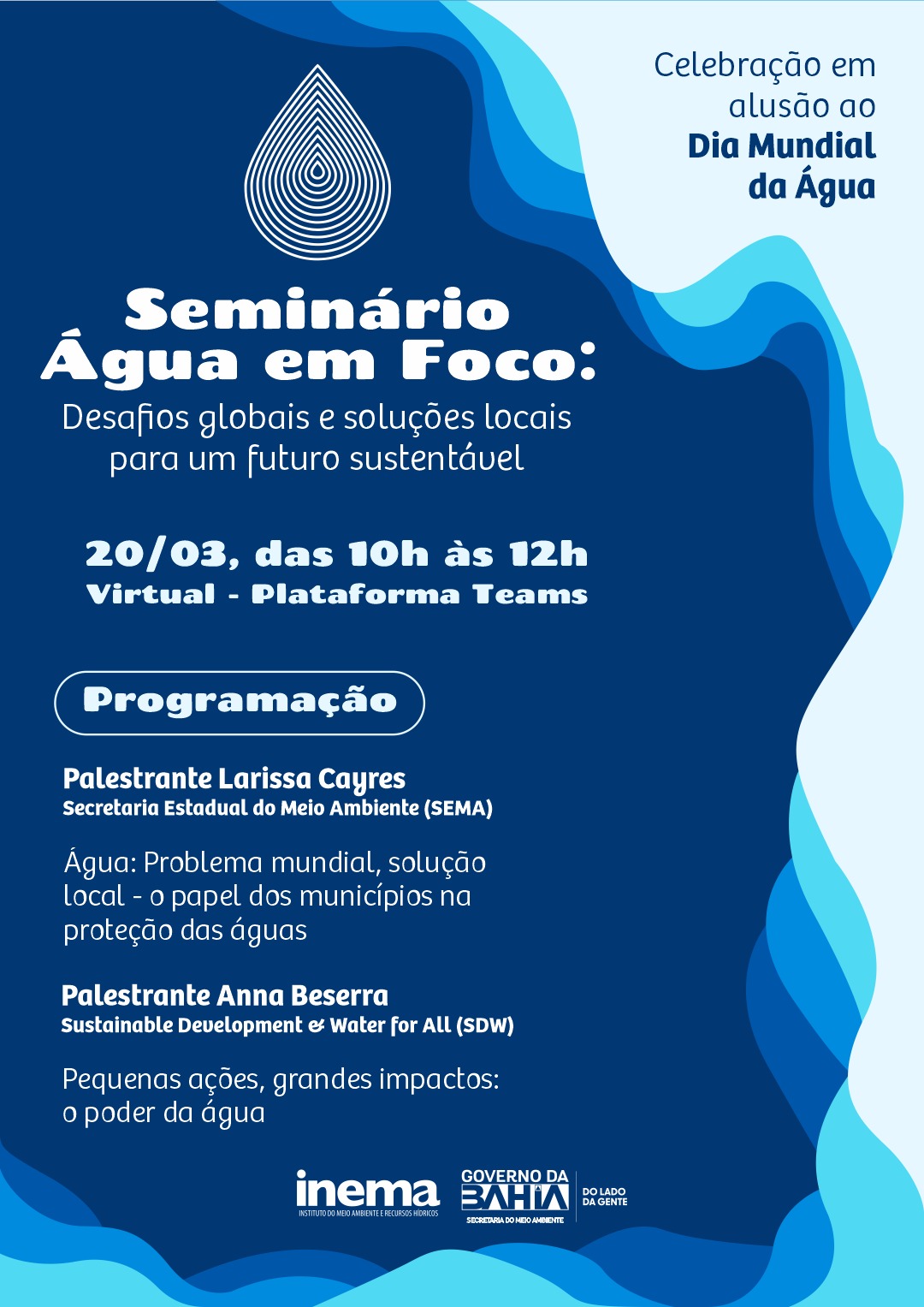 Em celebração ao Dia Mundial da Água, a Secretaria do Meio Ambiente da Bahia (Sema), por meio da Superintendência de Políticas e Planejamento Ambiental (SPA), promove, no próximo dia 20 de março, o Seminário Água em Foco: Desafios Globais e Soluções Locais para um Futuro Sustentável. O encontro integra as ações do Programa de Gestão Ambiental Compartilhada (GAC) e será realizado das 10h às 12h, reunindo especialistas e técnicos de consórcios públicos intermunicipais para discutir estratégias de proteção das águas a partir da atuação dos municípios.