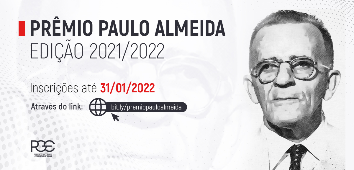 Estão abertas até o dia 31 de janeiro de 2022 as inscrições para o Prêmio Paulo Almeida edição 2021/2022. A iniciativa visa premiar os 02 (dois) melhores trabalhos elaborados pelos procuradores do Estado da Bahia no exercício das funções de consultoria jurídica e de representação judicial do Estado pela qualidade técnico-jurídica das minutas processuais.