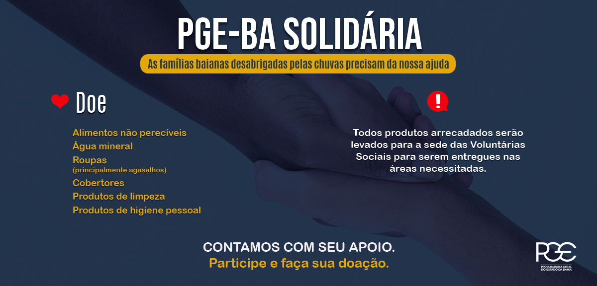 A Procuradoria Geral do Estado da Bahia realiza a campanha de doações “ PGE-BA Solidária ". O momento crítico exige a empatia e a solidariedade de todos em favor dos desabrigados pelas fortes chuvas no sul da Bahia.