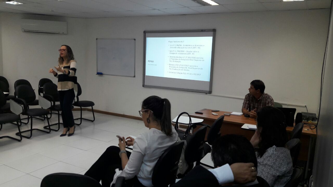 A procuradora chefe do Centro de Estudos e Aperfeiçoamento (CEA) da Procuradoria Geral do Estado, Alzemeri Martins Ribeiro de Britto, reuniu-se, ontem (25) à tarde, com servidores e procuradores lotados em diversas unidades da PGE para apresentar o Programa de Estágio de Nível Superior de Pós-Graduação em Direito – PEPGD, instituído pelo órgão.