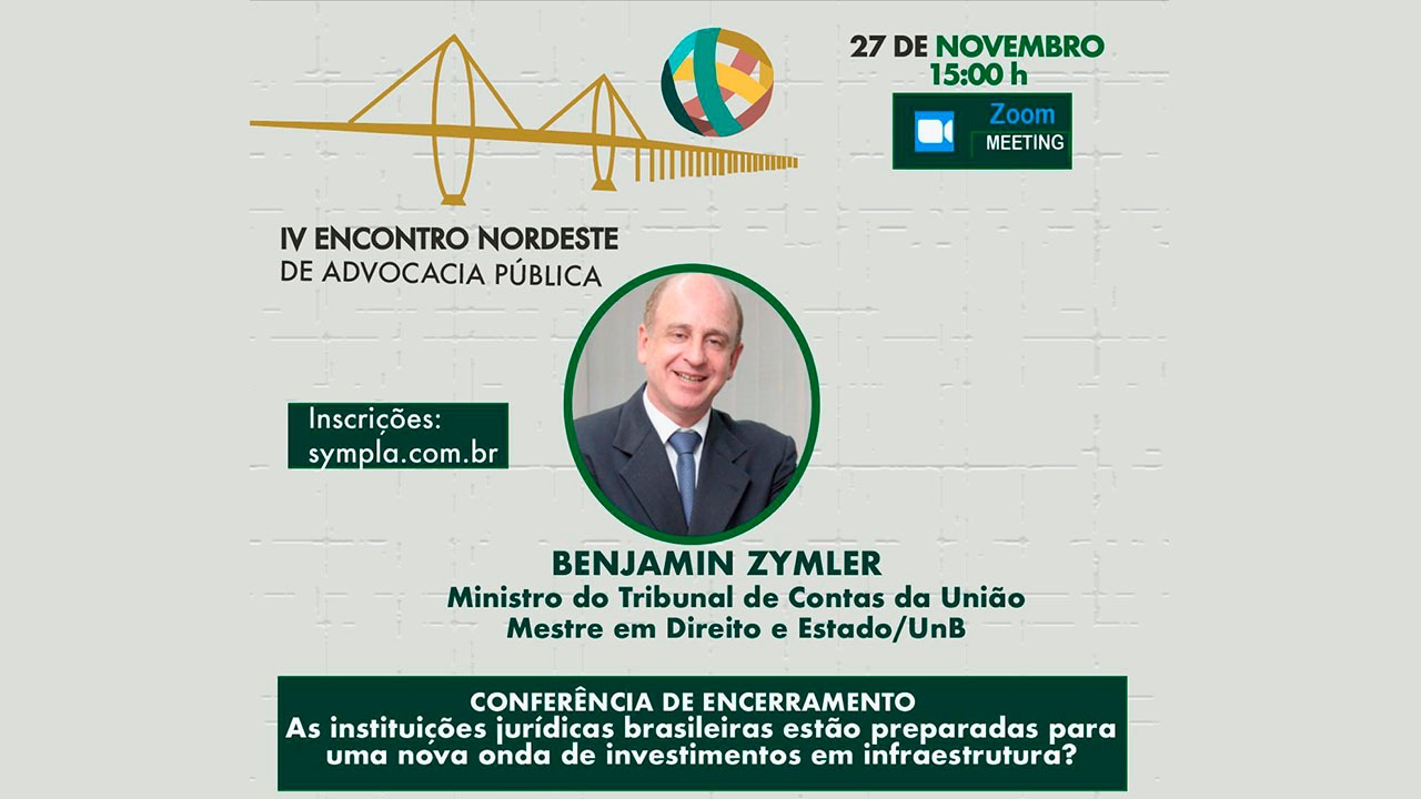 Uma conferência com o ministro do Tribunal de Contas da União, Benjamin Zymler, encerra amanhã (27) a programação do IV Encontro Nordeste de Advocacia Pública. O evento, que teve início na terça-feira (24), reuniu mais de 20 conferencistas da área jurídica, que discutiram a região Nordeste sob o tema Direito, Infraestrutura e Desenvolvimento Sustentável. Organizado pelos Centros de Estudos das Procuradorias Gerais do Maranhão (PGE/MA) e da Bahia (PGE/BA), o evento foi realizado virtualmente e teve como público-alvo professores, membros do Poder Judiciário e dos Tribunais de Contas, procuradores, advogados da União e secretários de Estado.