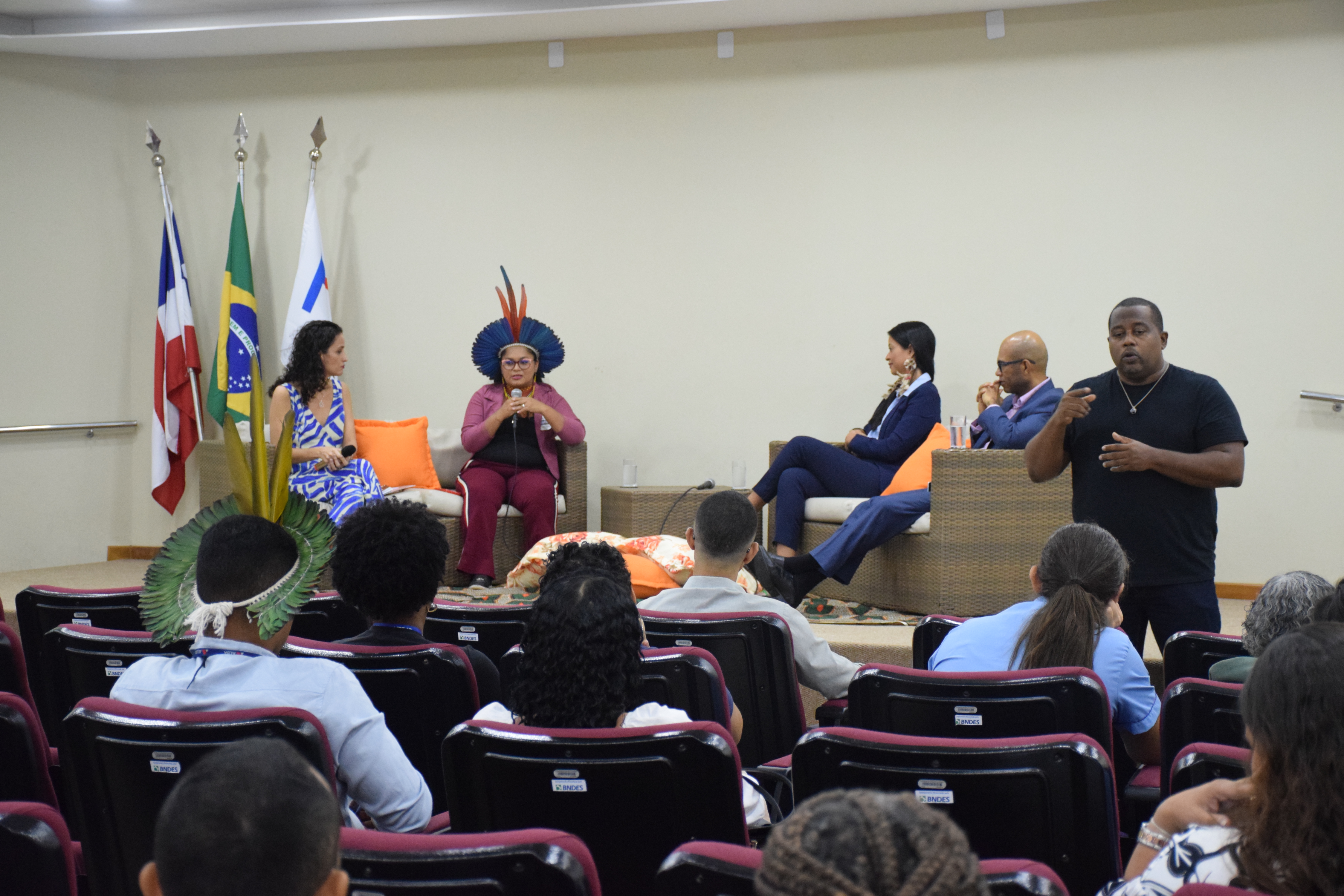 O auditório Paulo Spínola recebeu na manhã desta quinta-feira (18), a Roda de Conversa “Guardiões da Terra: Direitos e Cultura dos Povos Originários”. Promovido pelo Centro de Estudos e Aperfeiçoamento (CEA) da Procuradoria Geral do Estado da Bahia (PGE-BA), o evento contou com a participação de Samêhy Pataxó, presidente da Associação de Mulheres Indígenas do Extremo Sul da Bahia, Aléssia Bertuleza, Defensora Pública da Bahia e do Procurador Federal, Antônio Pedro.