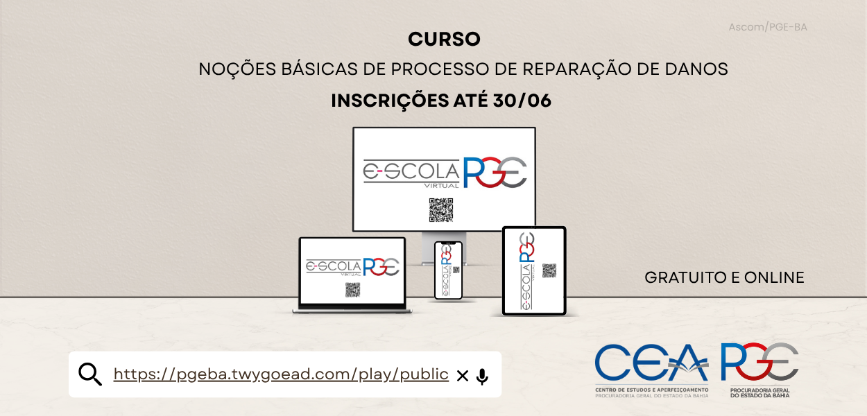 A Escola Virtual da Procuradoria Geral do Estado da Bahia (PGE-BA) segue com as inscrições abertas para o seu primeiro curso: “Noções Básicas de Reparação de Danos”. Gratuito, online e com carga horária de 8 horas, o curso tem início previsto para o dia 1º de julho de 2025.