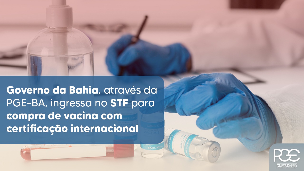 A Procuradoria Geral do Estado da Bahia (PGE) alegou haver inconstitucionalidade parcial do art. 16 da Medida Provisória nº 1.026/2021, postulando que seja atribuído, de acordo com a Constituição, um caráter puramente exemplificativo ao rol das agências sanitárias ali citadas para admitir a importação e distribuição de vacina que ainda não tenha sido registrada na Anvisa e se houver registro por agência regional de referência certificada pela Organização Panamericana de Saúde (OPAS). Solicitou, ainda, medida cautelar até a decisão final da ADIN. A Ação Direta de Inconstitucionalidade foi elaborado pelo procurador Miguel Calmon Teixeira de Carvalho Dantas com apoio dos procuradores Ruy Sérgio Deiró da Paixão, Frederico Augusto Valverde Oliveira e Silvio Avelino Pires Britto Júnior.