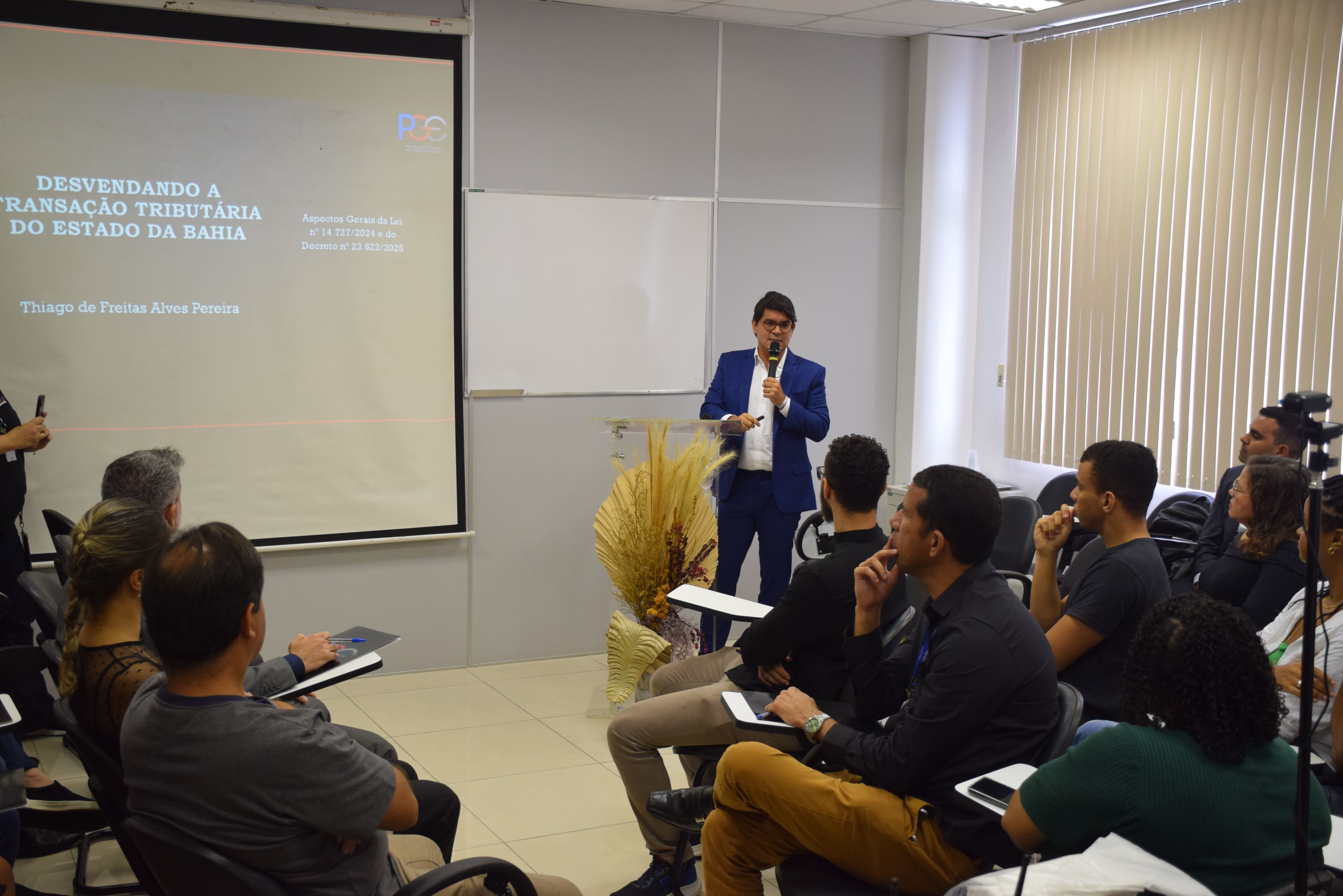 Thiago Freitas apresentou o tema “Desvendando a Transação Tributária do Estado da Bahia”, explicando os fundamentos da Lei nº 14.727/2024 e do Decreto nº 23.622/2025. Ele destacou a transação tributária como instrumento de auto composição, ancorado em pilares como eficiência, regularização fiscal, diálogo e construção de pontes com os contribuintes. A norma prevê, por exemplo, descontos de até 95%, parcelamento em até 120 vezes e a possibilidade de utilização de precatórios e créditos acumulados para abatimento do saldo devedor.
