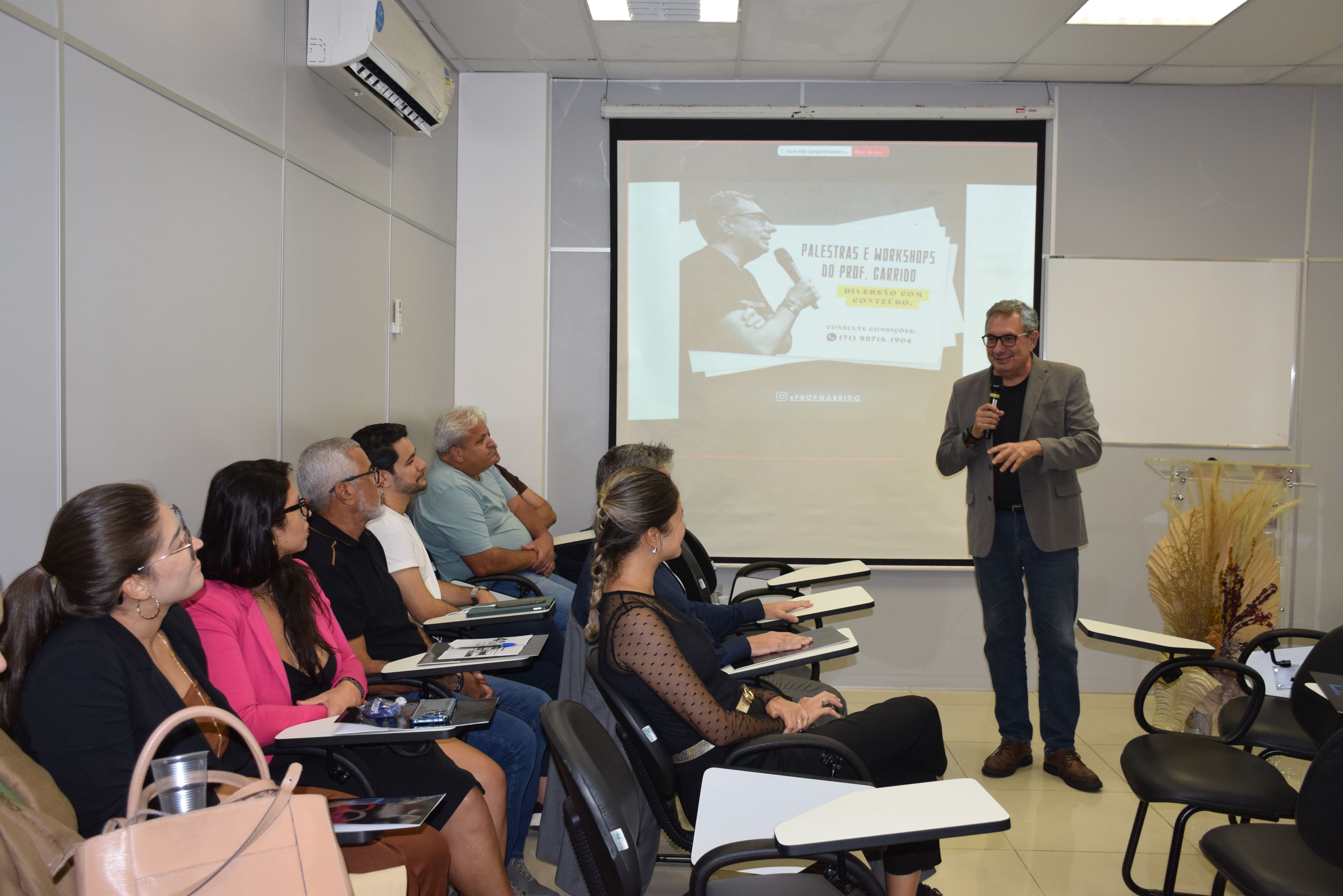 Abrindo o turno da tarde, o Procurador Chefe da PROIN, Frederico Caiado, conduziu uma reunião com o corpo funcional. Em seguida, o professor Garrido ministrou a palestra “Propósito e trabalho em equipe, com uma abordagem envolvente sobre a diferença entre estímulo e motivação. Utilizando histórias da sua trajetória pessoal, provocou reflexões sobre vitimismo e reclamação, propondo um exercício prático aos presentes: passar um dia inteiro sem reclamar de nada.