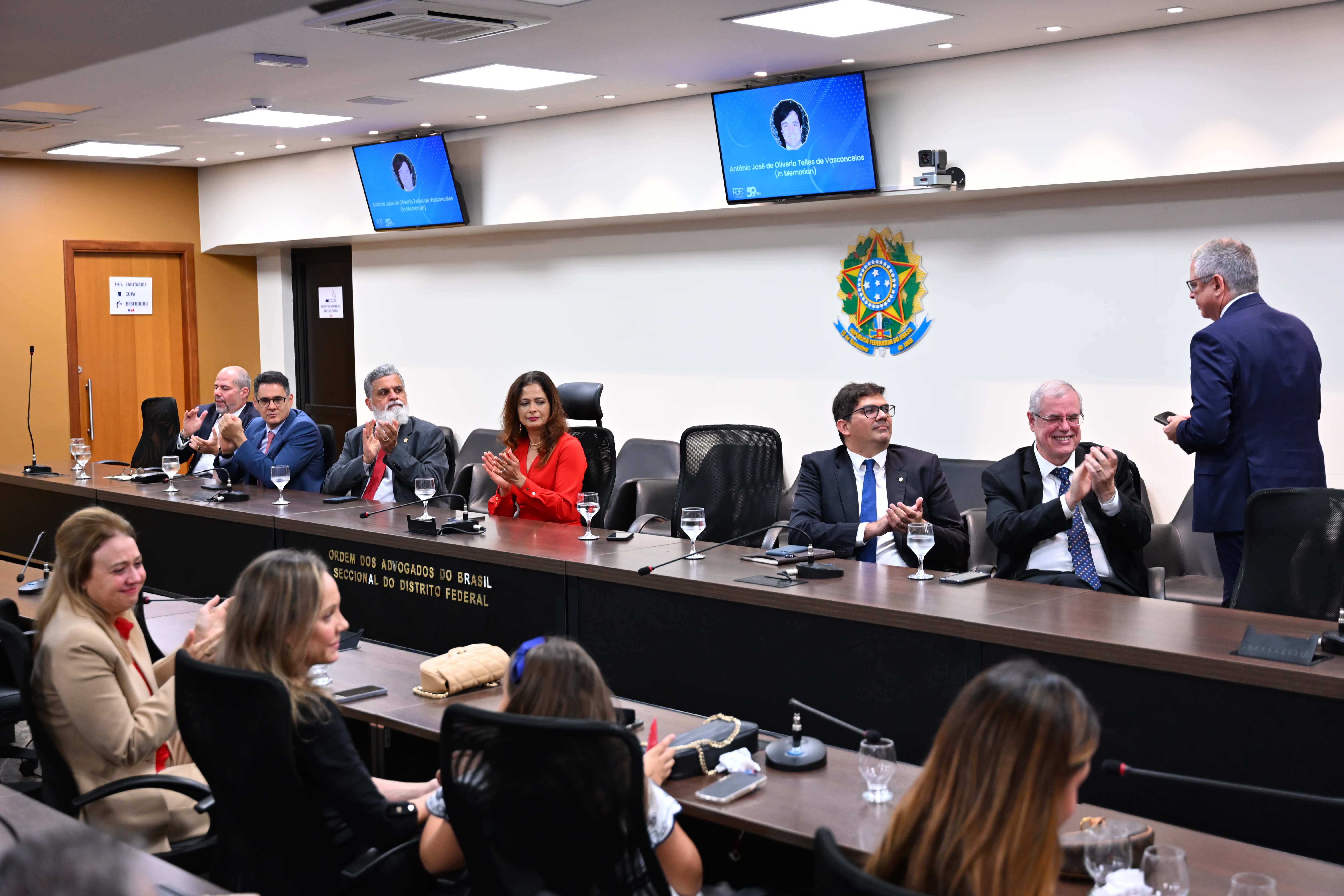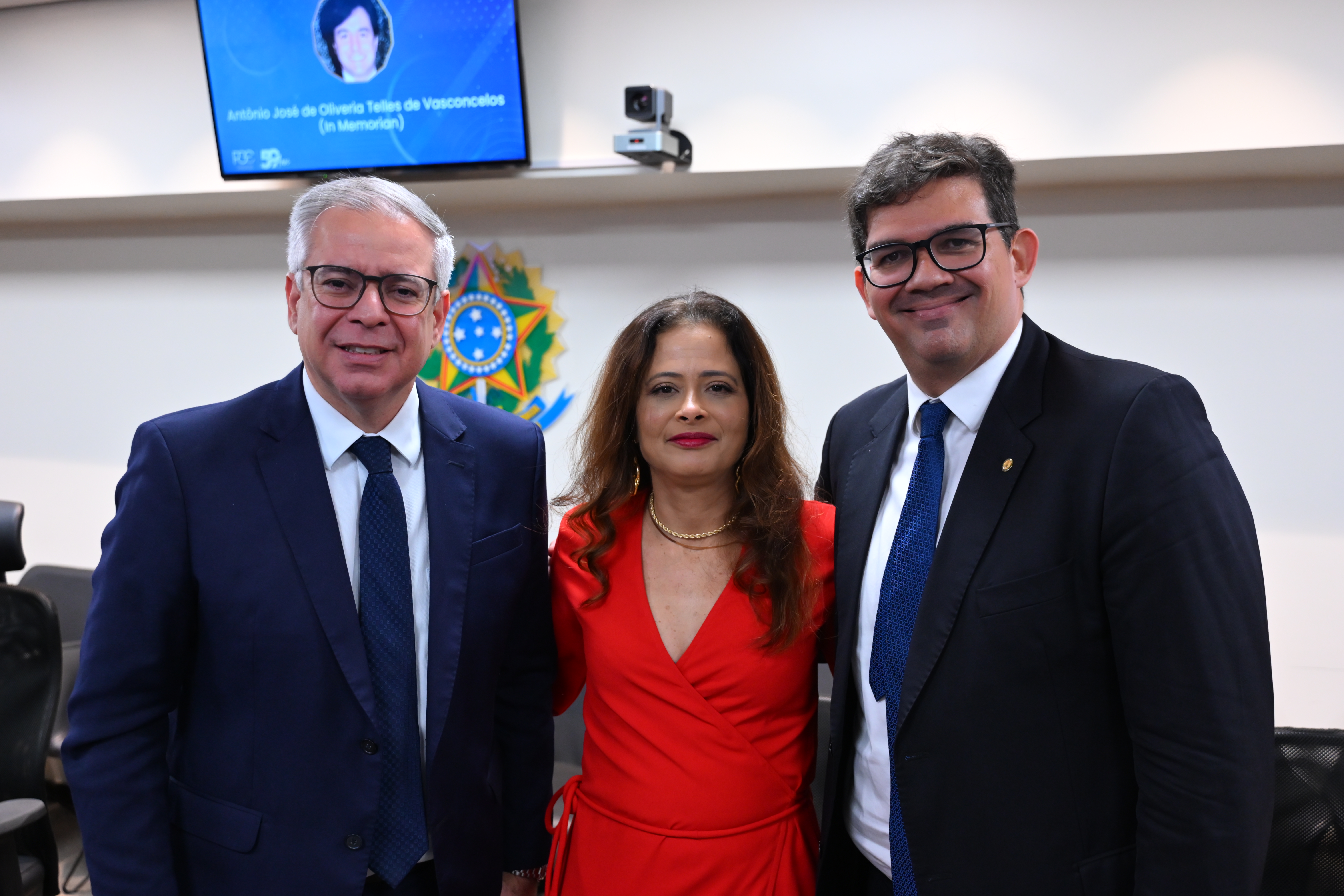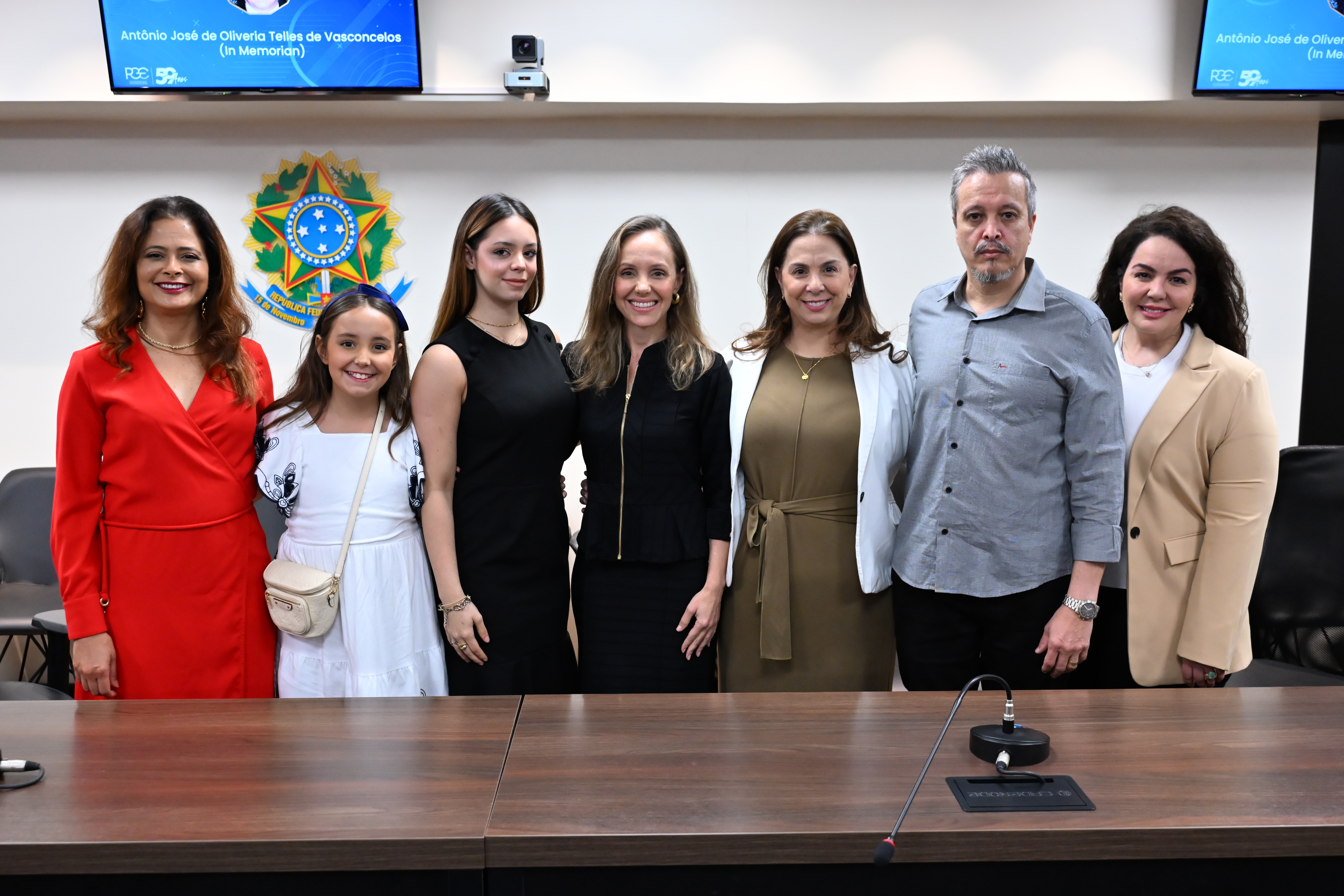 A imagem mostra uma mesa de autoridades em um auditório. Sete pessoas estão sentadas atrás da mesa, sendo seis homens e uma mulher ao centro, vestida com um blazer vermelho. Todos usam trajes formais. À frente, há várias pessoas sentadas assistindo. Na parede ao fundo, há o brasão da República do Brasil e três telas que exibem a foto de um homem com os dizeres: “Antônio José de Oliveira Telles de Vasconcelos (In Memoriam)”. O ambiente é iluminado e transmite formalidade, indicando uma cerimônia de homenagem