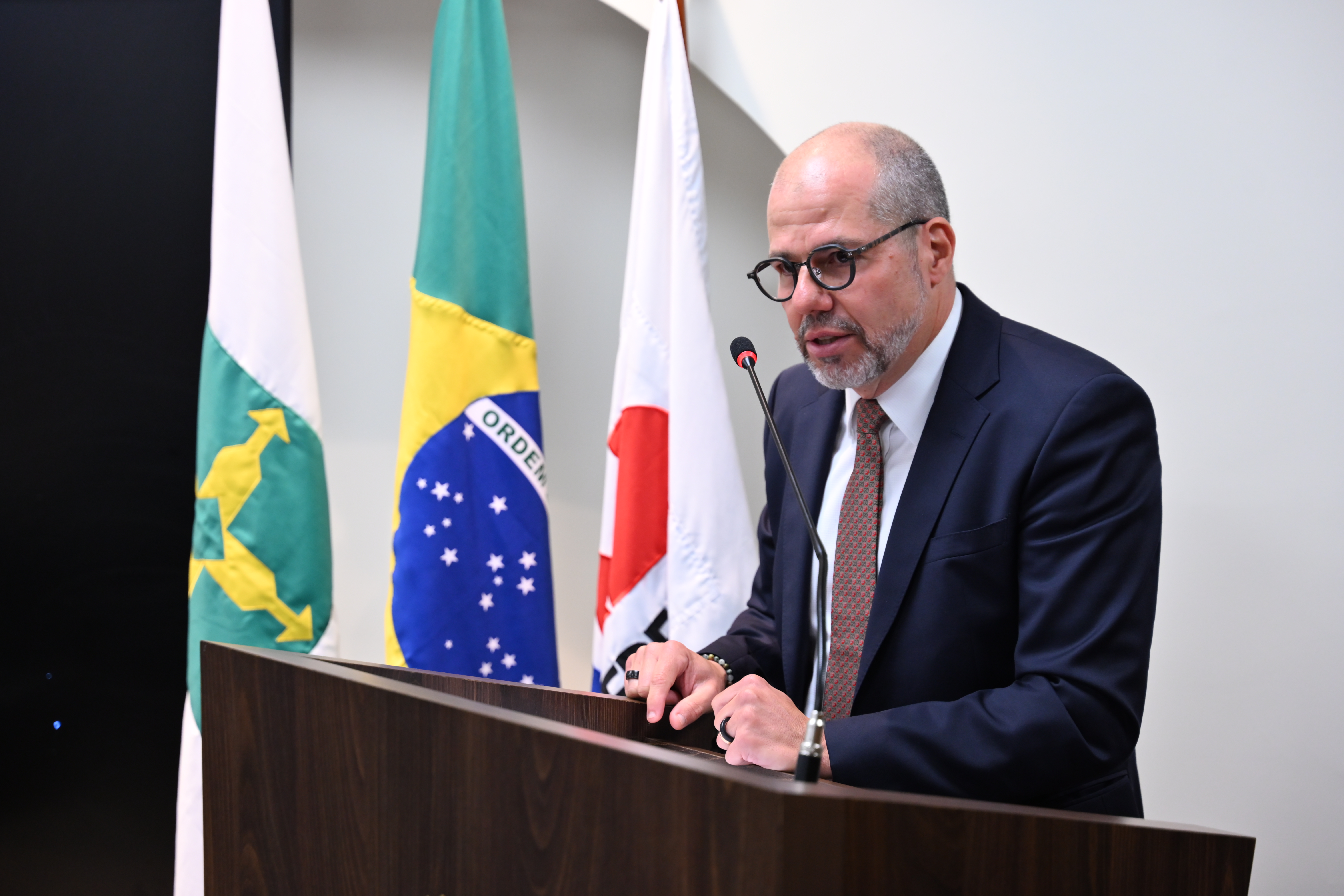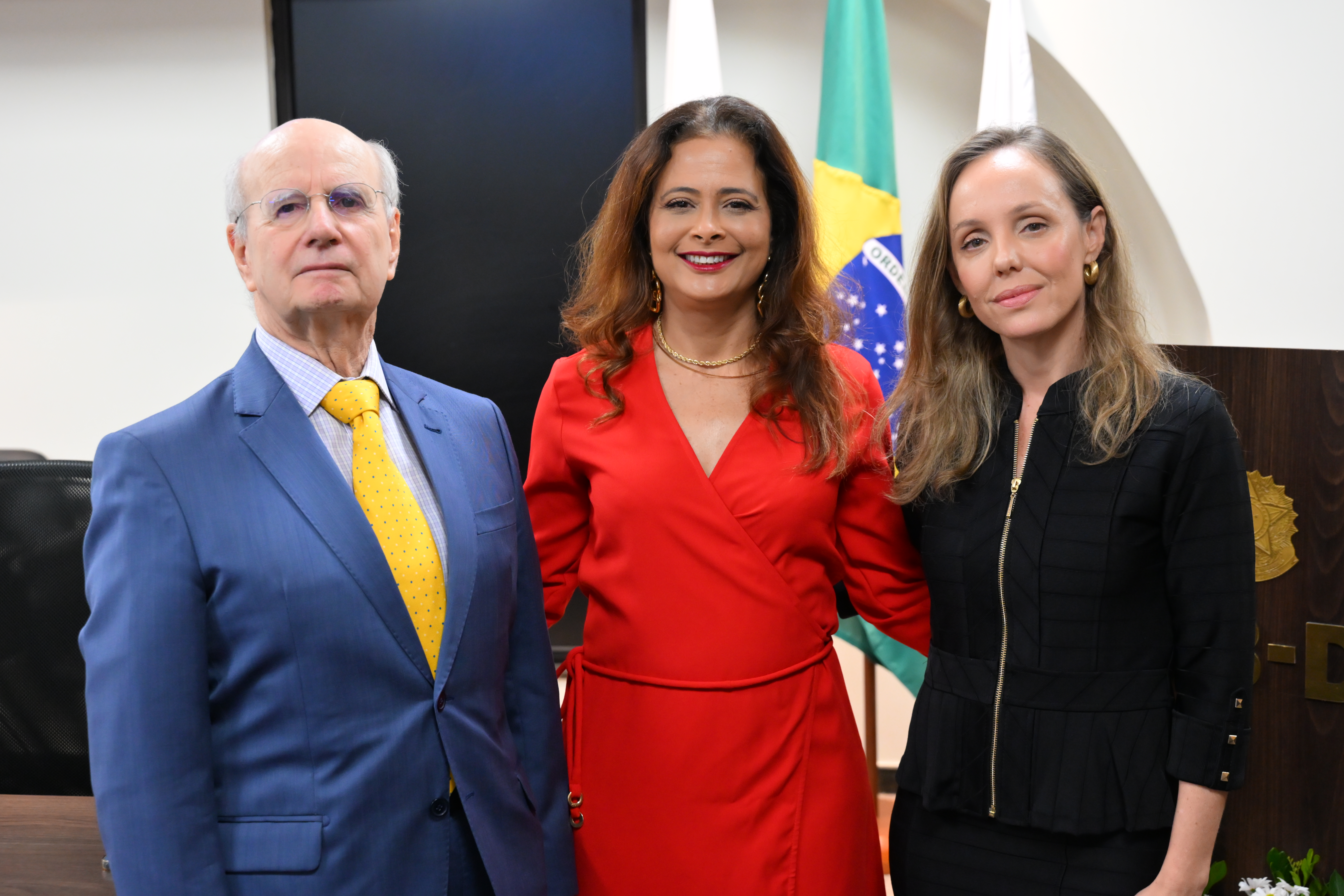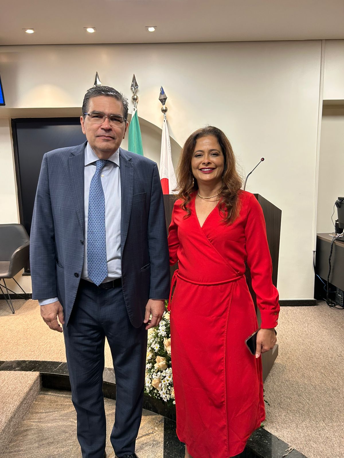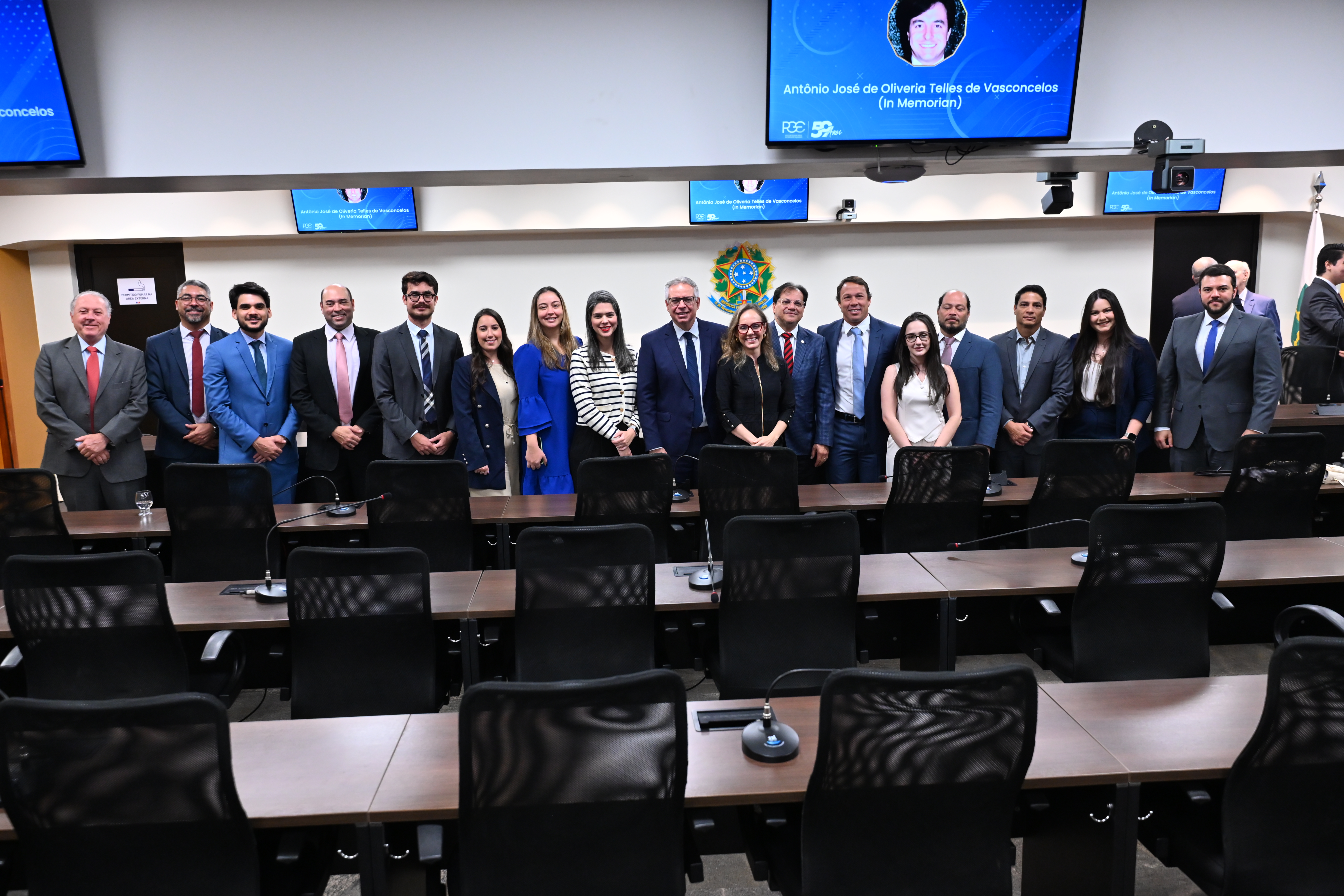 A imagem mostra uma mesa de autoridades em um auditório. Sete pessoas estão sentadas atrás da mesa, sendo seis homens e uma mulher ao centro, vestida com um blazer vermelho. Todos usam trajes formais. À frente, há várias pessoas sentadas assistindo. Na parede ao fundo, há o brasão da República do Brasil e três telas que exibem a foto de um homem com os dizeres: “Antônio José de Oliveira Telles de Vasconcelos (In Memoriam)”. O ambiente é iluminado e transmite formalidade, indicando uma cerimônia de homenagem
