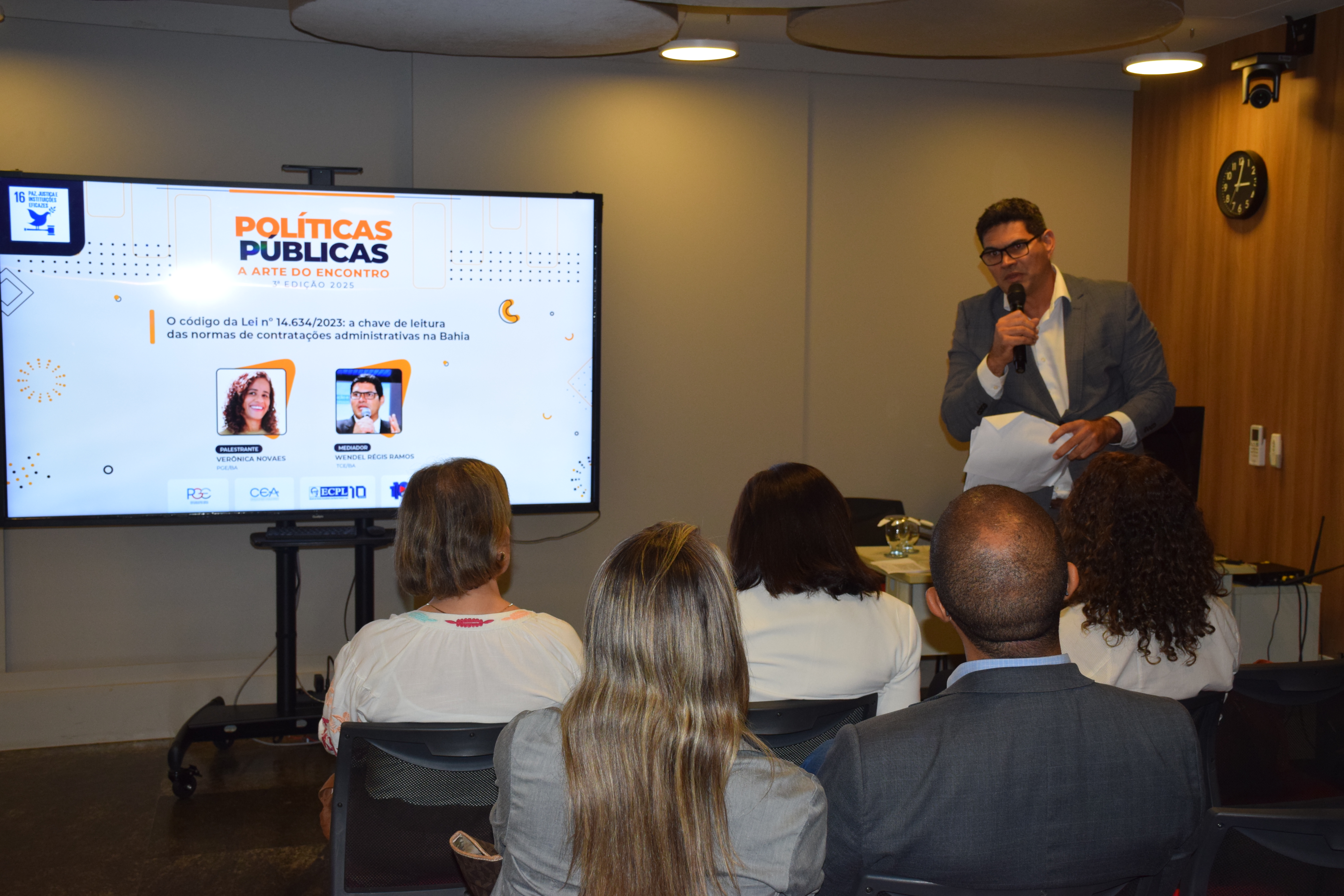 Na tarde desta quarta-feira (03), a Procuradoria Geral do Estado da Bahia (PGE-BA) e o Tribunal de Contas do Estado da Bahia (TCE-BA) realizaram mais uma edição do ciclo de palestras “Políticas Públicas – A Arte do Encontro”, com o tema “O Código da Lei nº 14.634/2023: a chave de leitura das normas de contratações administrativas na Bahia”. O evento reuniu servidores do TCE-BA, do TCM-BA e da administração pública estadual, na Sala de Treinamento da ECPL.