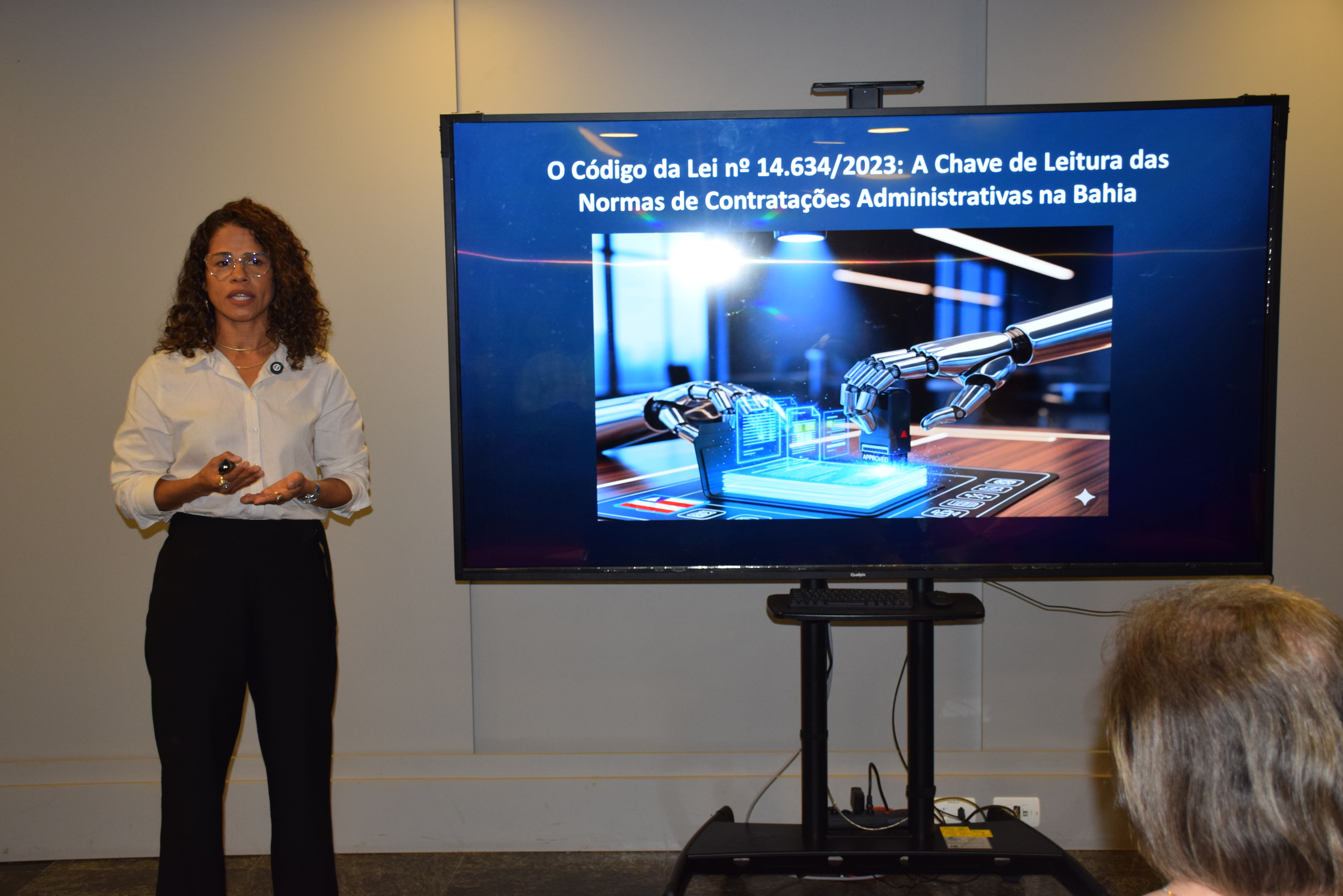 A palestra foi conduzida pela Procuradora do Estado Verônica Novaes, integrante do Núcleo de Licitações e Contratos da Procuradoria Administrativa da PGE-BA, que participou ativamente da elaboração da Lei nº 14.634/2023. Em sua exposição, a procuradora apresentou os principais aspectos da norma, destacando que a legislação baiana não se limitou a reproduzir a Lei Federal nº 14.133/2021, mas adotou uma “chave de leitura própria”.