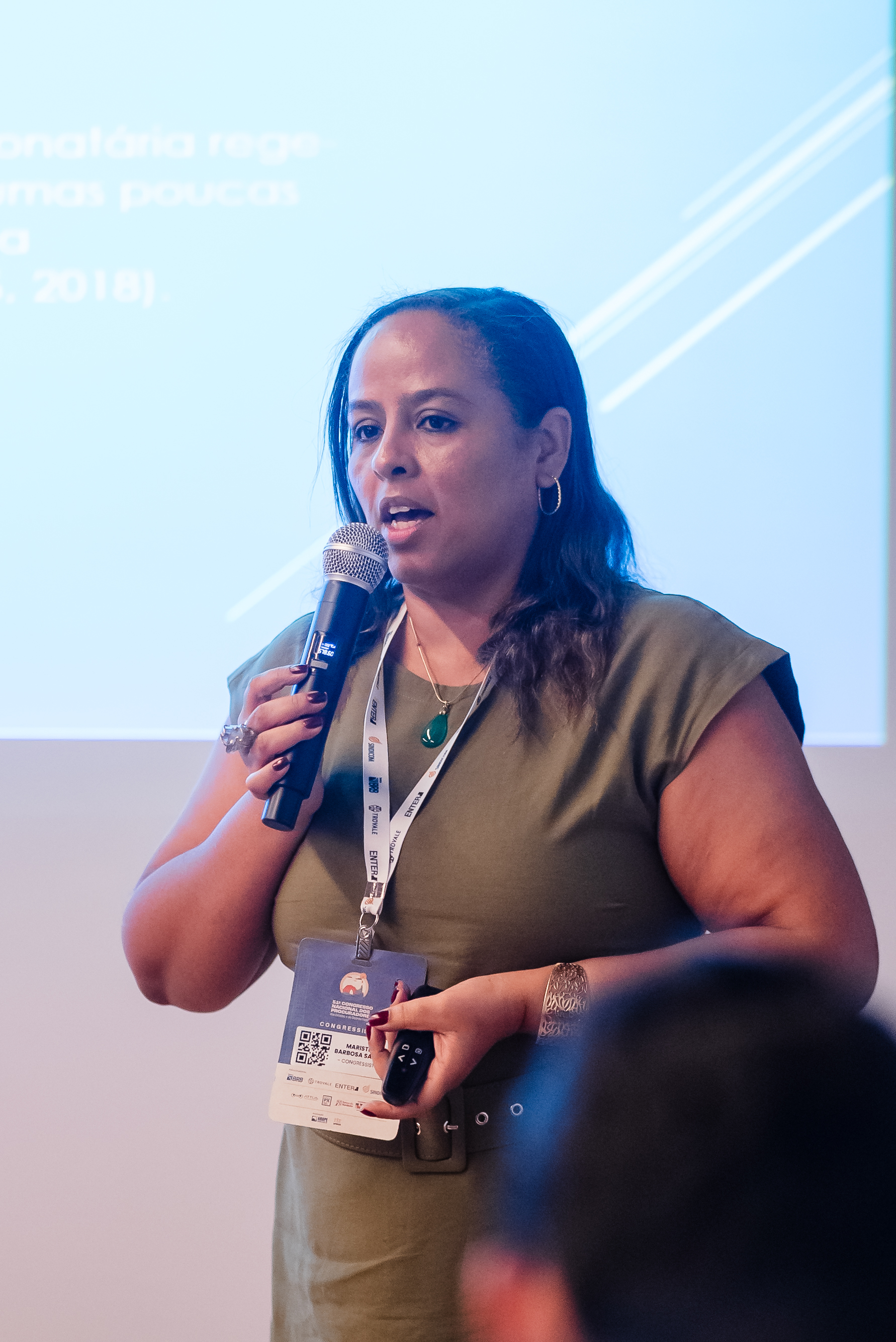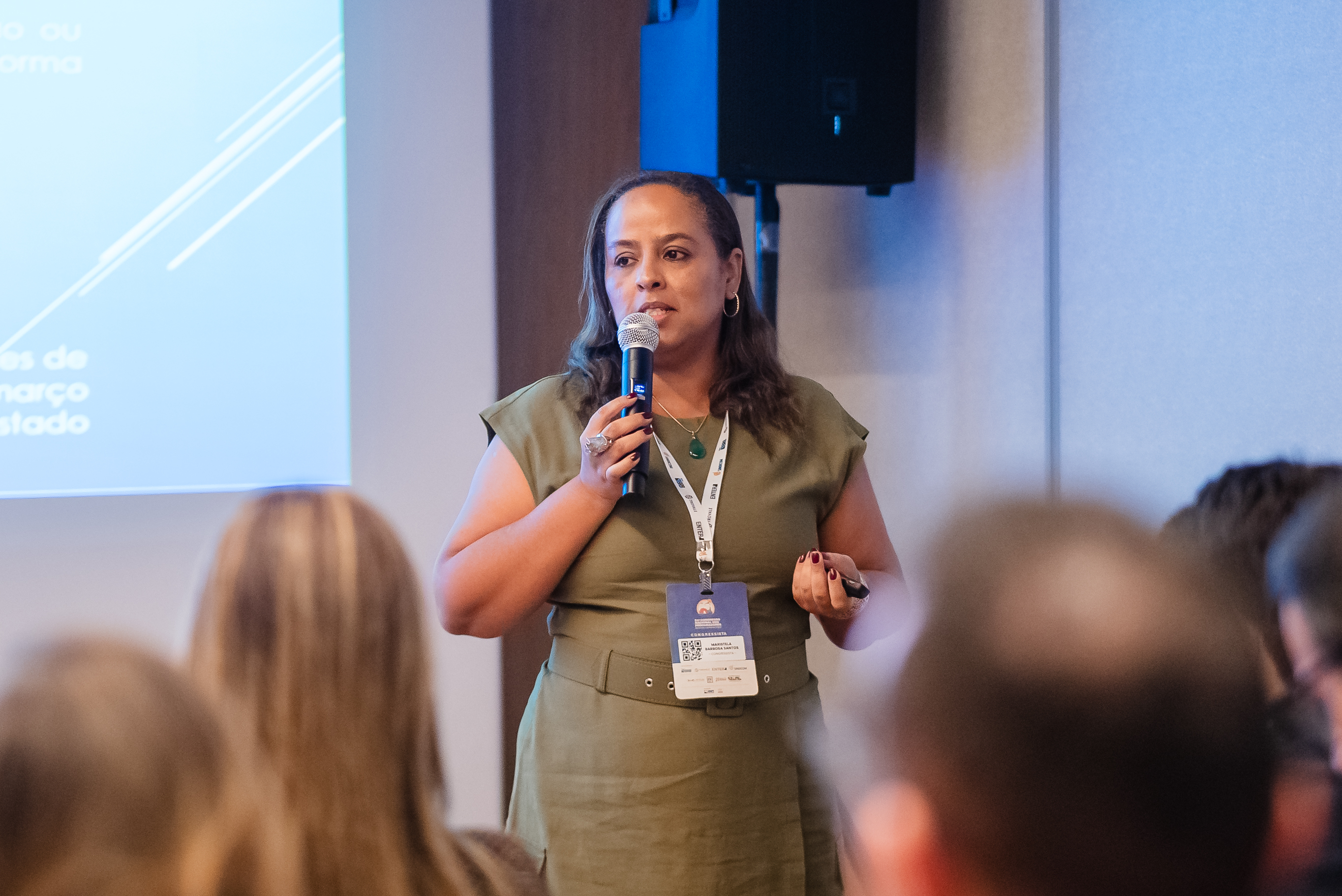 Close da palestrante, mulher de pele clara e cabelos castanhos soltos, usando vestido verde e crachá. Ela segura microfone e controle, enquanto fala ao público atento.