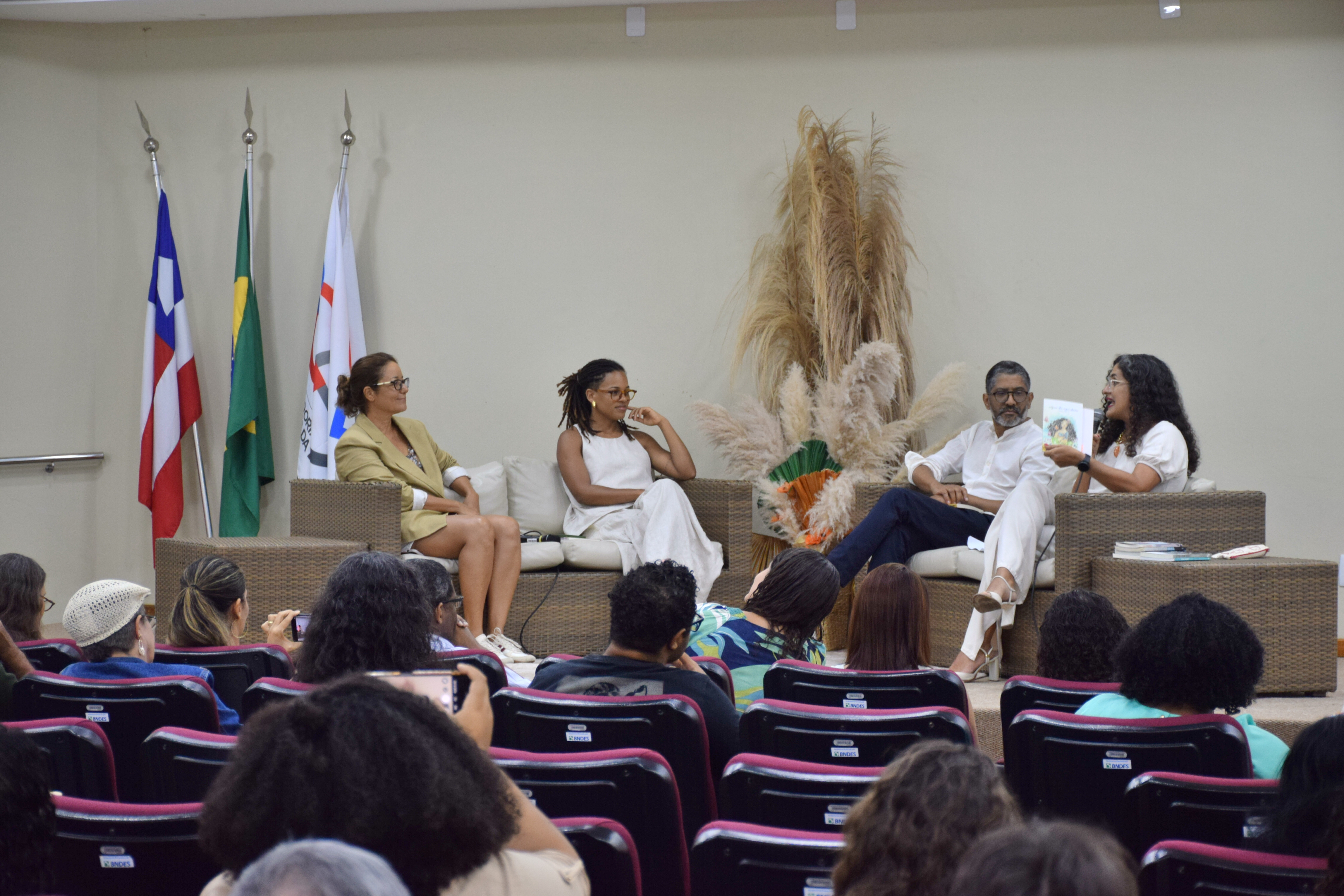 A programação começou com uma Roda de Conversa que reuniu três nomes de destaque da literatura contemporânea — Calila das Mercês, Bianca Vasconcellos e Jeferson Tenório — mediada pela Procuradora do Estado Janaina Mascarenhas. Calila falou sobre suas raízes no sertão e no Recôncavo baiano, destacando que sua formação literária mescla ancestralidade, natureza e vivência acadêmica. Ela descreveu Planta Oração como um “livro-poema-conto” no qual oralidade e ritmos ancestrais se entrelaçam para transformar narrativas em meditações.