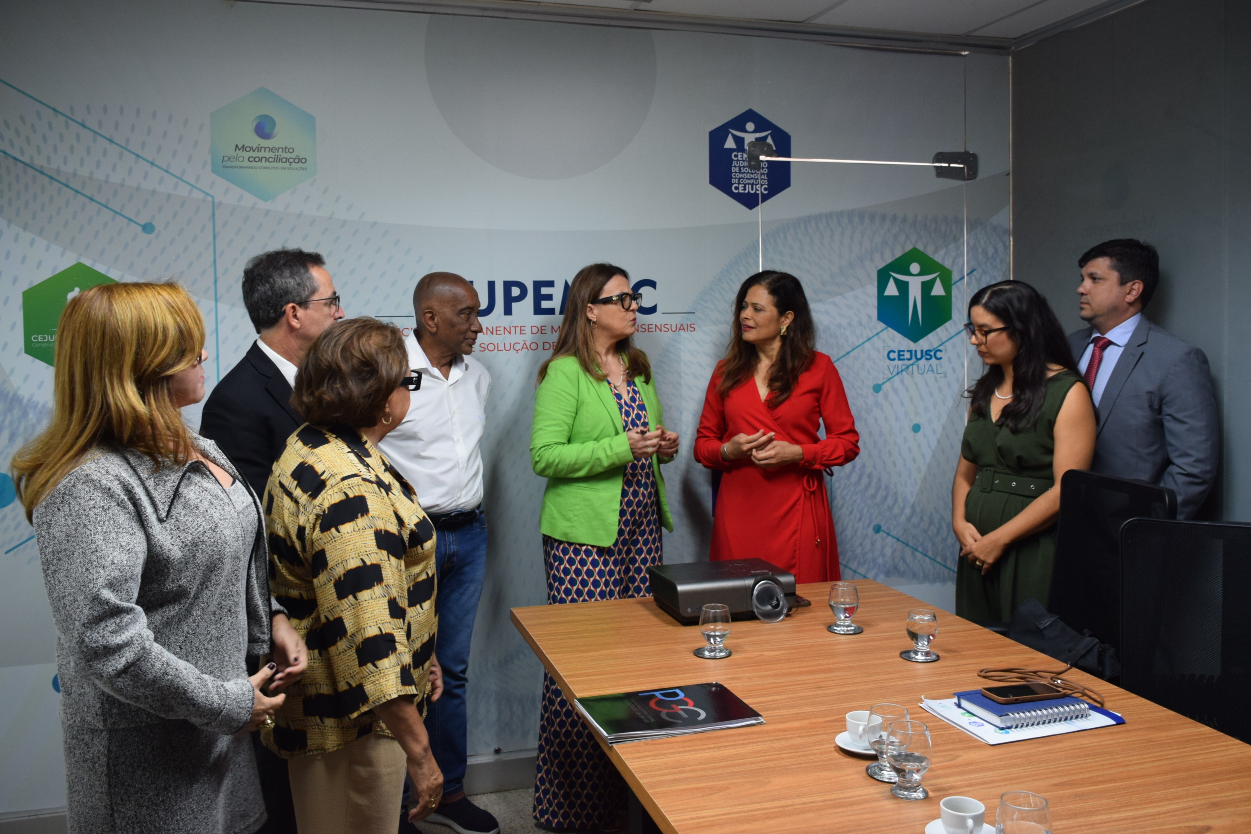 Grupo de oito pessoas em pé, dentro de uma sala de reuniões, conversando em frente a uma parede com logotipos do Poder Judiciário e do CEJUSC.