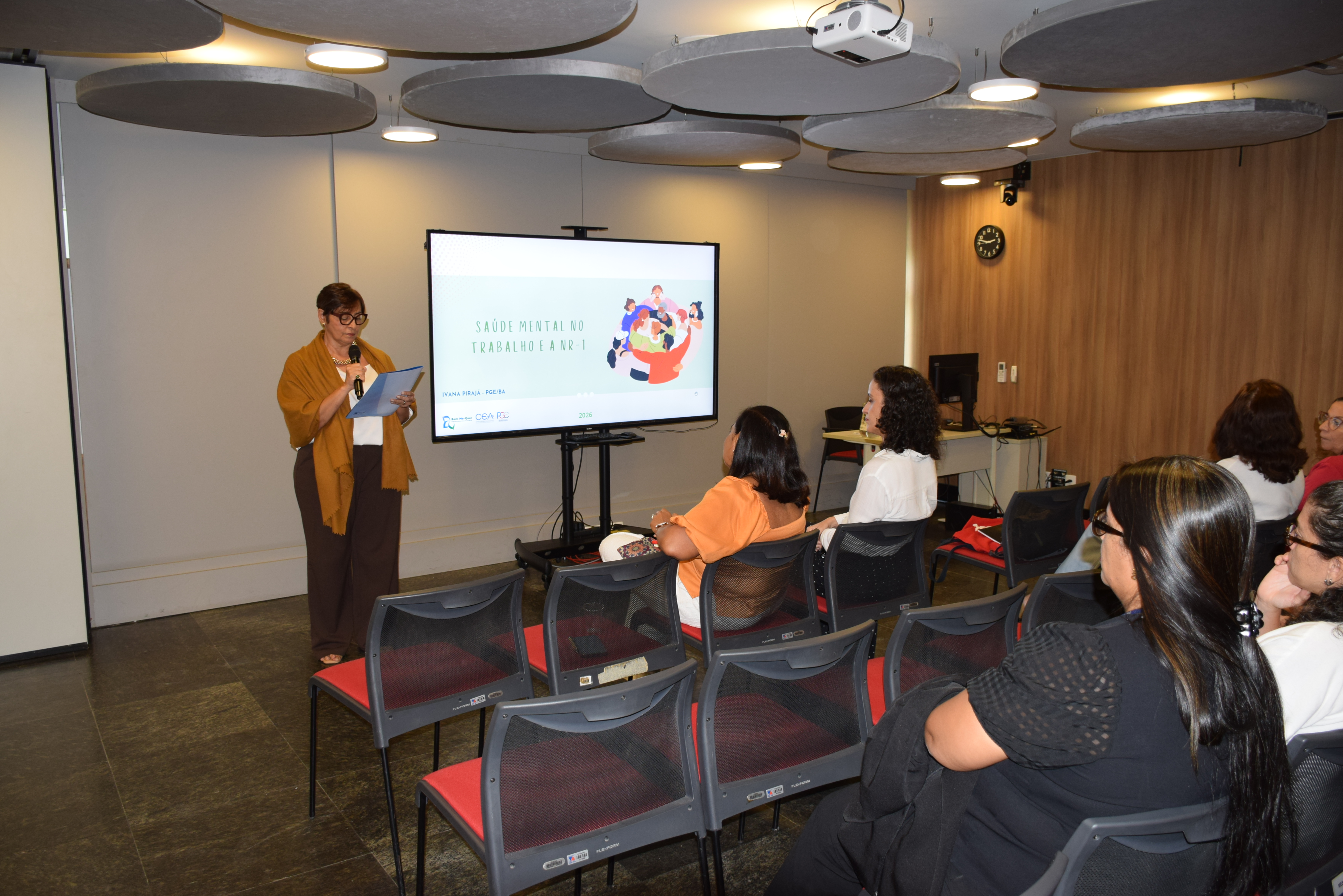 A palestra foi conduzida pela Procuradora Chefe do Centro de Estudos e Aperfeiçoamento (CEA) da PGE, Ivana Pirajá. Durante a apresentação, ela destacou o avanço da NR-1 ao incorporar a atenção aos riscos psicossociais no ambiente de trabalho. Segundo a procuradora, o tema exige mudança de cultura institucional e a adoção de ações preventivas contínuas.