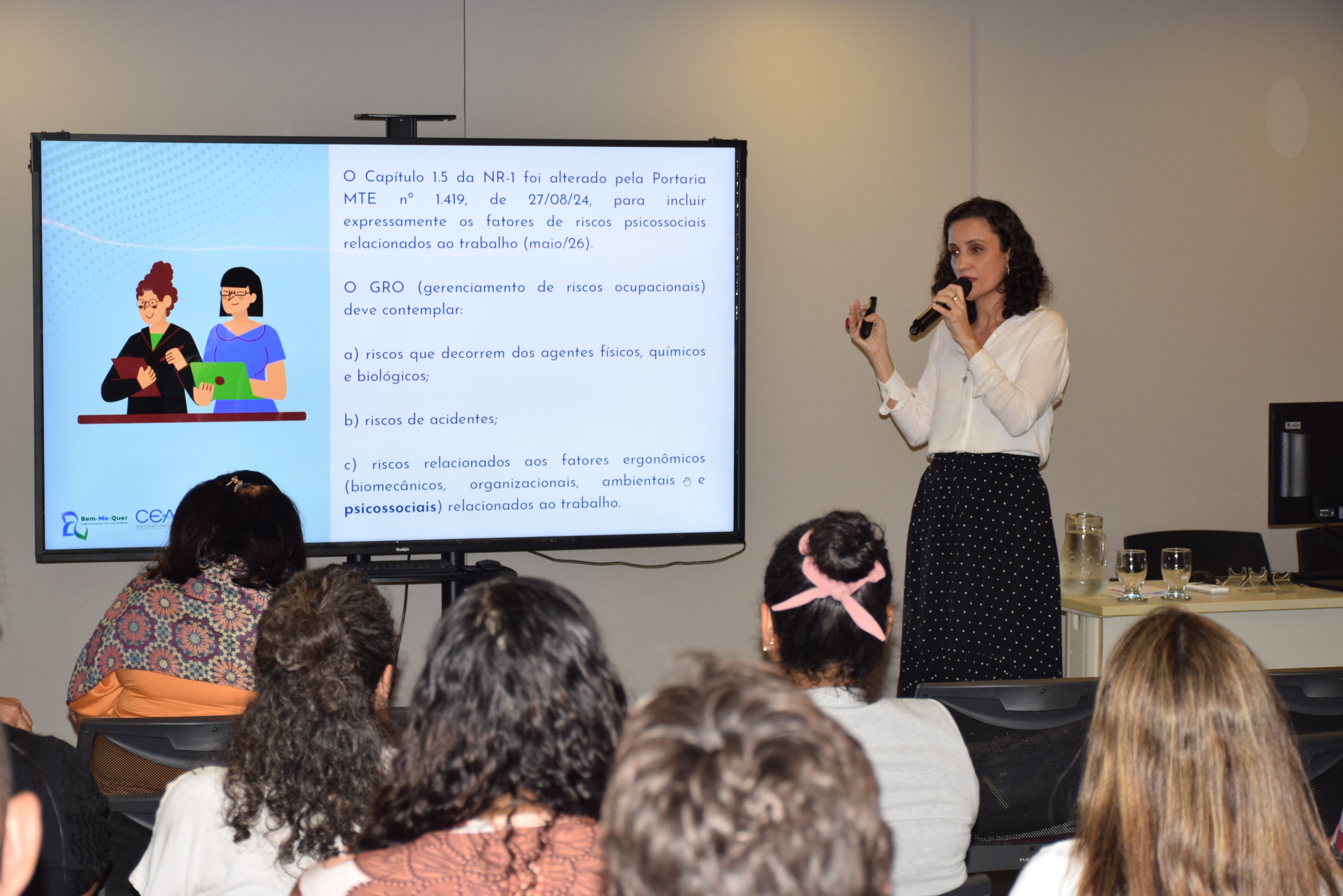 A procuradora apresentou dados sobre o número de afastamentos decorrentes de problemas de saúde mental e o impacto do absenteísmo no fluxo de trabalho das instituições. Também ressaltou que o cuidado com a saúde mental é um direito garantido pela Constituição, e que a NR-1 contribui para a estruturação de políticas institucionais voltadas à prevenção.