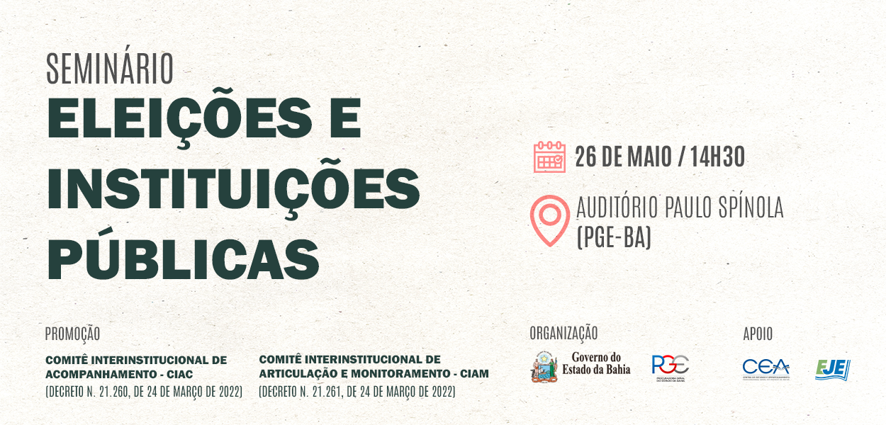 O papel das instituições públicas nas eleições de 2022, sua relevância para a concretização do processo eleitoral e a importância da conduta dos agentes públicos neste ano são aspectos que serão abordados durante o seminário “Eleições e instituições públicas”, que a Procuradoria Geral do Estado da Bahia (PGE-BA) promove, nesta quinta-feira (26/5), às 14h30min, no auditório do órgão, com o apoio da Escola Judiciária Eleitoral do Tribunal Regional Eleitoral da Bahia e do Centro de Estudos e Aperfeiçoamento da PGE-BA.