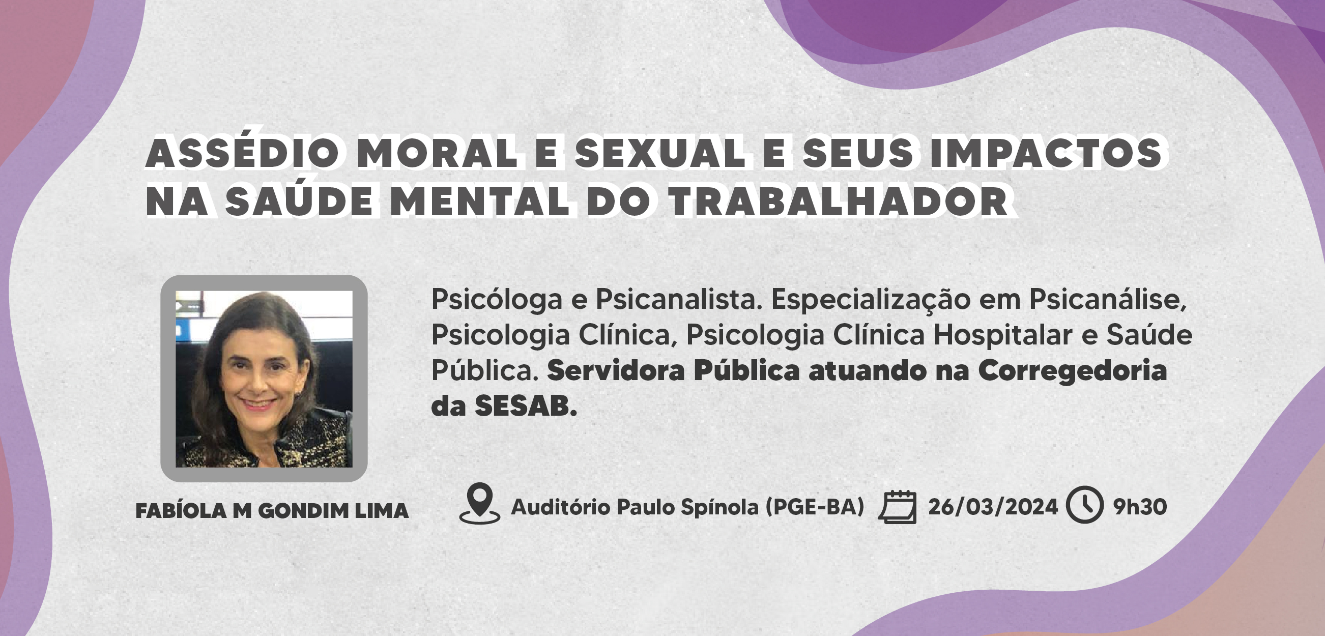No próximo dia 26, às 9h30, no auditório Paulo Spínola, da Procuradoria Geral do Estado da Bahia, será realizada uma palestra de grande relevância sobre assédio moral e sexual no ambiente de trabalho e seus impactos na saúde mental dos trabalhadores. O evento é promovido pelo Centro de Estudos e Aperfeiçoamento e contará com a presença de Fabíola M. Gondim Lima, psicóloga e psicanalista com especialização em psicanálise e psicologia clínica hospitalar e saúde pública.