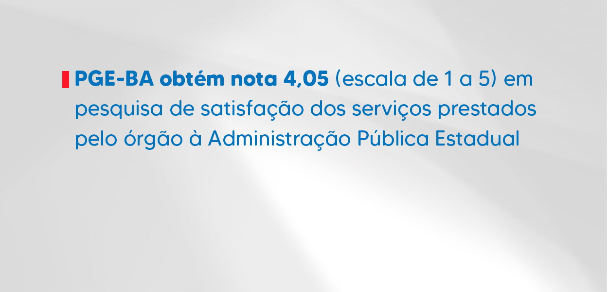 O nível de satisfação dos servidores públicos do Estado da Bahia em relação aos serviços prestados pela PGE-BA, numa escala de 1 a 5, teve nota 4,05, aponta o resultado da pesquisa externa de satisfação realizada pelo órgão entre os dias 27/09 a 30/11/2021. O trabalho de apuração foi realizado através da Gestão Estratégica (GESP) e de seu Escritório de Acompanhamento da Estratégia, em parceria com a Superintendência de Estudos Econômicos e Sociais da Bahia (SEI), junto aos Órgãos e Entidades do Estado.