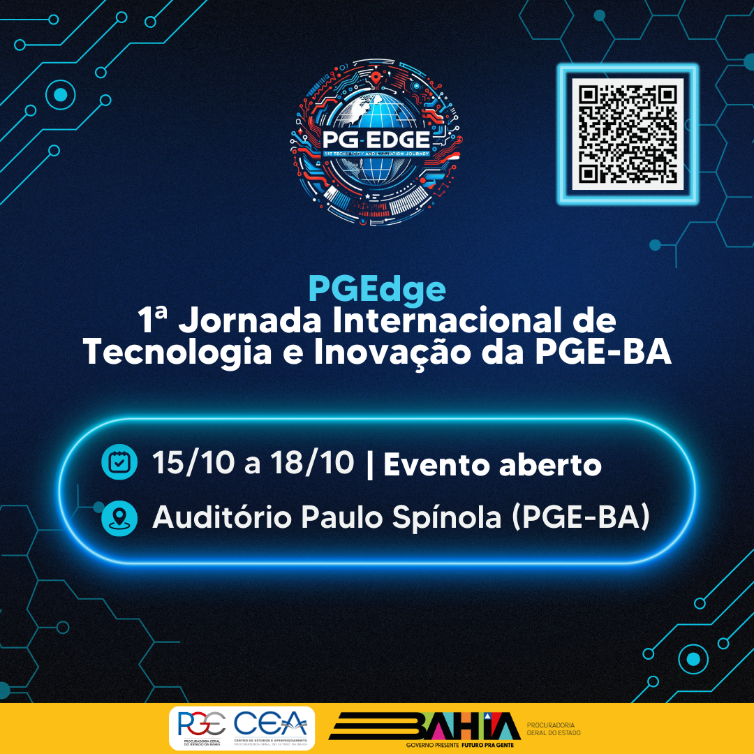 A Procuradoria Geral do Estado da Bahia (PGE-BA) realiza, entre os dias 15 e 18 de outubro, a 1ª Jornada Internacional de Tecnologia e Inovação. O evento, que acontece no Auditório Paulo Spínola, é aberto ao público e tem como objetivo principal integrar a tecnologia à advocacia pública, capacitando profissionais para o uso de ferramentas como inteligência artificial e blockchain.