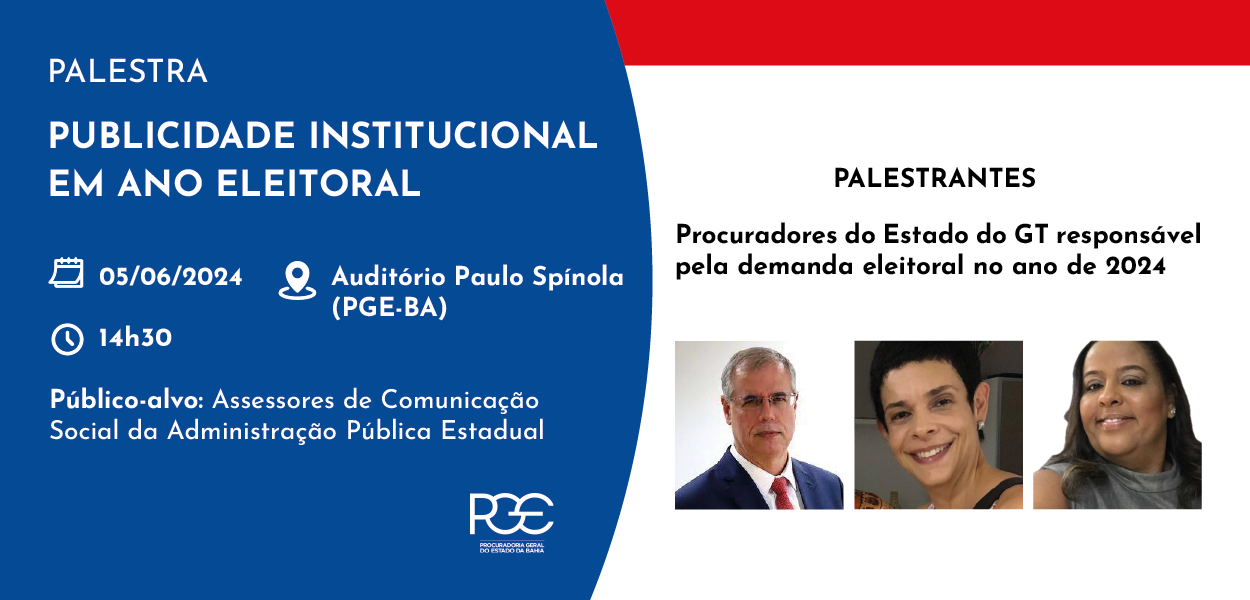 No próximo dia 5 de junho, às 14h30, a Procuradoria Geral do Estado da Bahia (PGE-BA) promoverá a palestra "Publicidade Institucional em Ano Eleitoral" no Auditório Paulo Spínola. Destinado aos Assessores de Comunicação Social da Administração Pública Direta e Indireta, o evento visa aprofundar o entendimento sobre as condutas éticas e legais que devem ser observadas durante o período eleitoral.