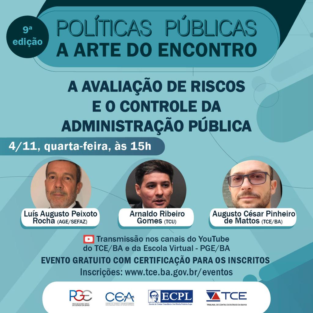 O Centro de Estudos e Aperfeiçoamento da Procuradoria Geral do Estado da Bahia (CEA), em parceria com a Escola de Contas Conselheiro José Borba Pedreira Lapa (ECPL), do Tribunal de Contas do Estado Bahia, realizam, no próximo dia 04, às 15h, através do canal do TCE no YouTube, mais uma live sobre Políticas Públicas - A Arte do Encontro. O evento é gratuito, com certificação e as inscrições podem ser realizadas no site www.tce.ba.gov.br/eventos.