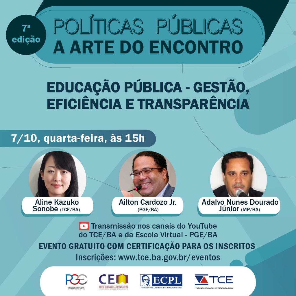 O Centro de Estudos e Aperfeiçoamento da Procuradoria Geral do Estado da Bahia (CEA), em parceria com a Escola de Contas Conselheiro José Borba Pedreira Lapa (ECPL), do Tribunal de Contas do Estado Bahia, realizam, no próximo dia 07, às 15h, através do canal do TCE no YouTube, mais uma live sobre Políticas Públicas - A Arte do Encontro. O evento é gratuito, com certificação e as inscrições podem ser realizadas no site www.tce.ba.gov.br/eventos.